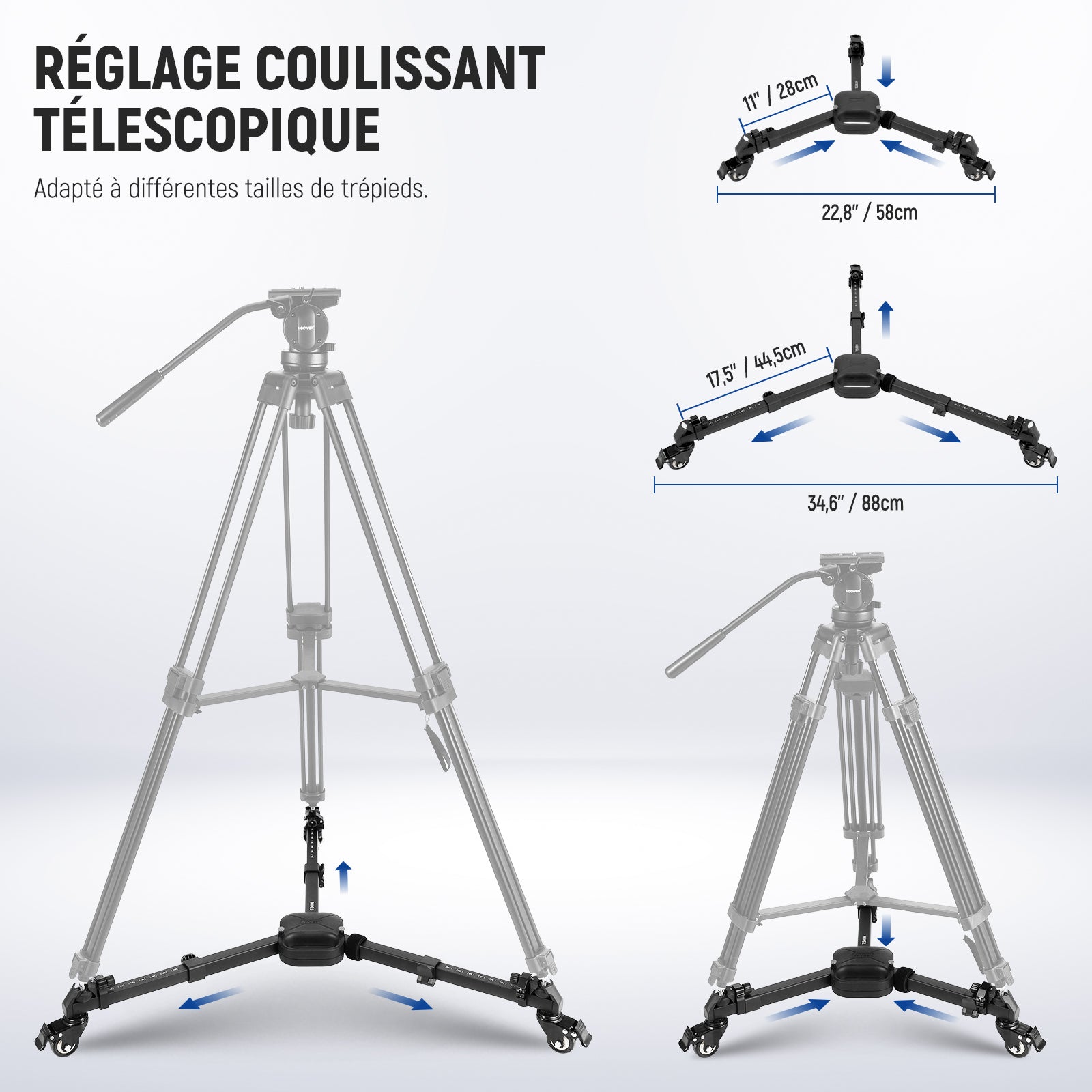 - 【Réglage télescopique et coulissant】 Le chariot pour trépied vidéo peut étendre son diamètre de 11"/28cm à 17,5"/44,5cm, s'adaptant à différentes tailles de trépied et angles d'ouverture, et améliorant l'adaptabilité aux espaces de studio exigus ou aux emplacements extérieurs étendus