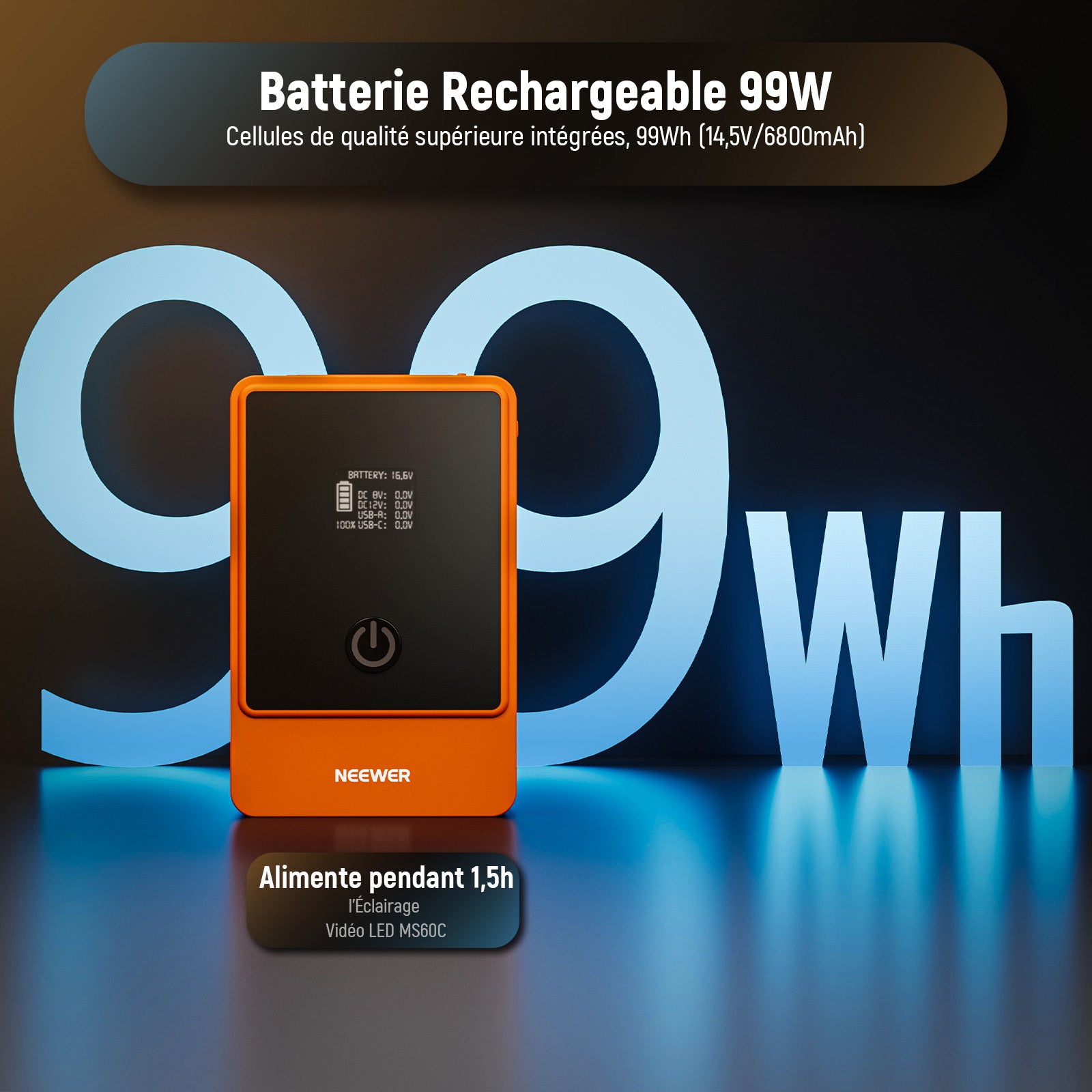 - 【Batterie Rechargeable 6800mAh】Avec une capacité de 6800mAh (99WH/14,54V), cette batterie fournit assez d'énergie pour les tournages vidéo ou de films,charge 7,7 fois pour Canon EOS R5 C, charge 5,8 fois pour iPhone 14 Pro, charge 3,3 fois pour iPad Pro 12,9" (2022), charge 1,5 fois pour MacBook Pro 14" (2022) et alimente pendant 1,5h pour éclairage vidéo LED MS60C. Elle peut être entièrement rechargé en 3h grâce à un chargeur D Tap de 16,8V ou un chargeur GaN à charge rapide PD (non inclus)