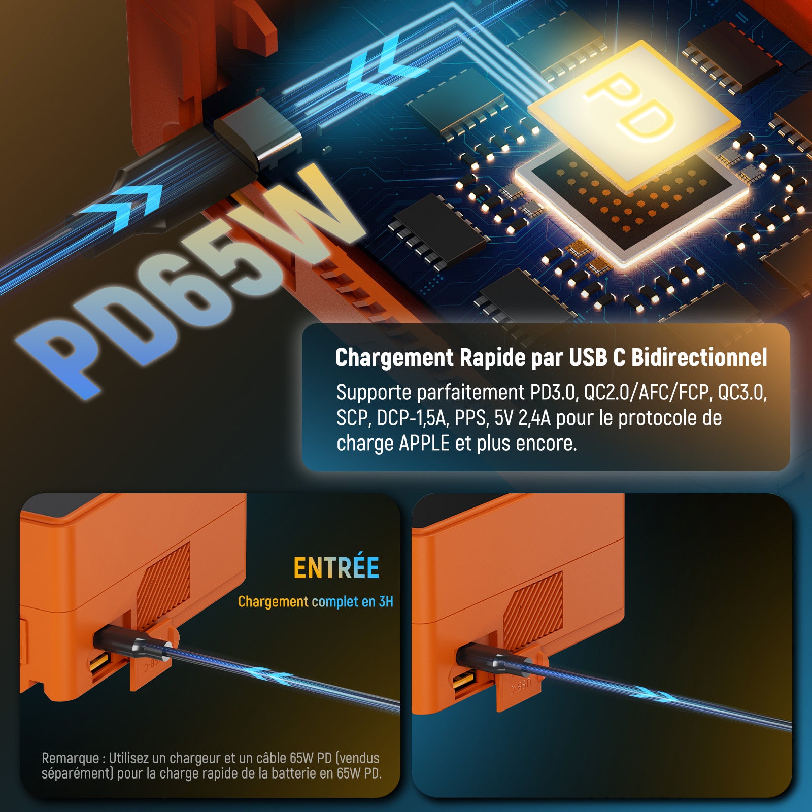 - 【Charge Rapide Bidirectionnelle 65W PD】Supporte PD3.0, QC2.0/AFC/FCP, QC3.0, SCP, DCP-1,5A, PPS, 5V 2,4A pour le protocole de charge APPLE... Le port USB C fournit une charge rapide bidirectionnelle PD de 65W pour les smartphones,tablettes et ordinateurs portables (chargeur PD non inclus), compatible avec iPhone 15 Pro Max 15 Plus 14 Pro Max Samsung S23 Ultra Huawei Mate 60 Google Pixel 8 7 Pro. Avec un câble D Tap,compatible avec Smallrig batteries V Lock NEEWER PS050E PS099E PS099EP PS150E