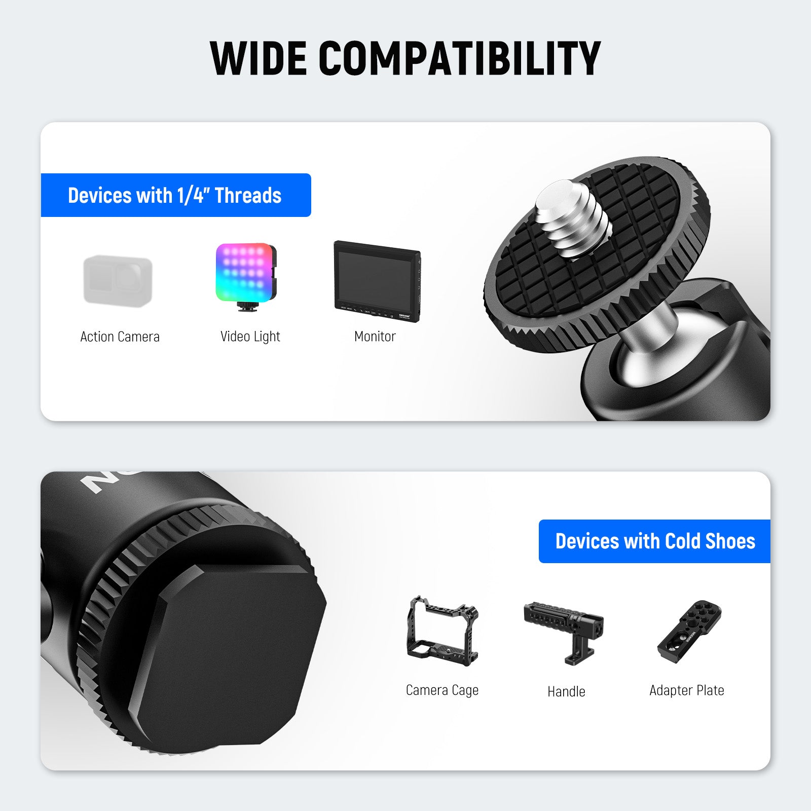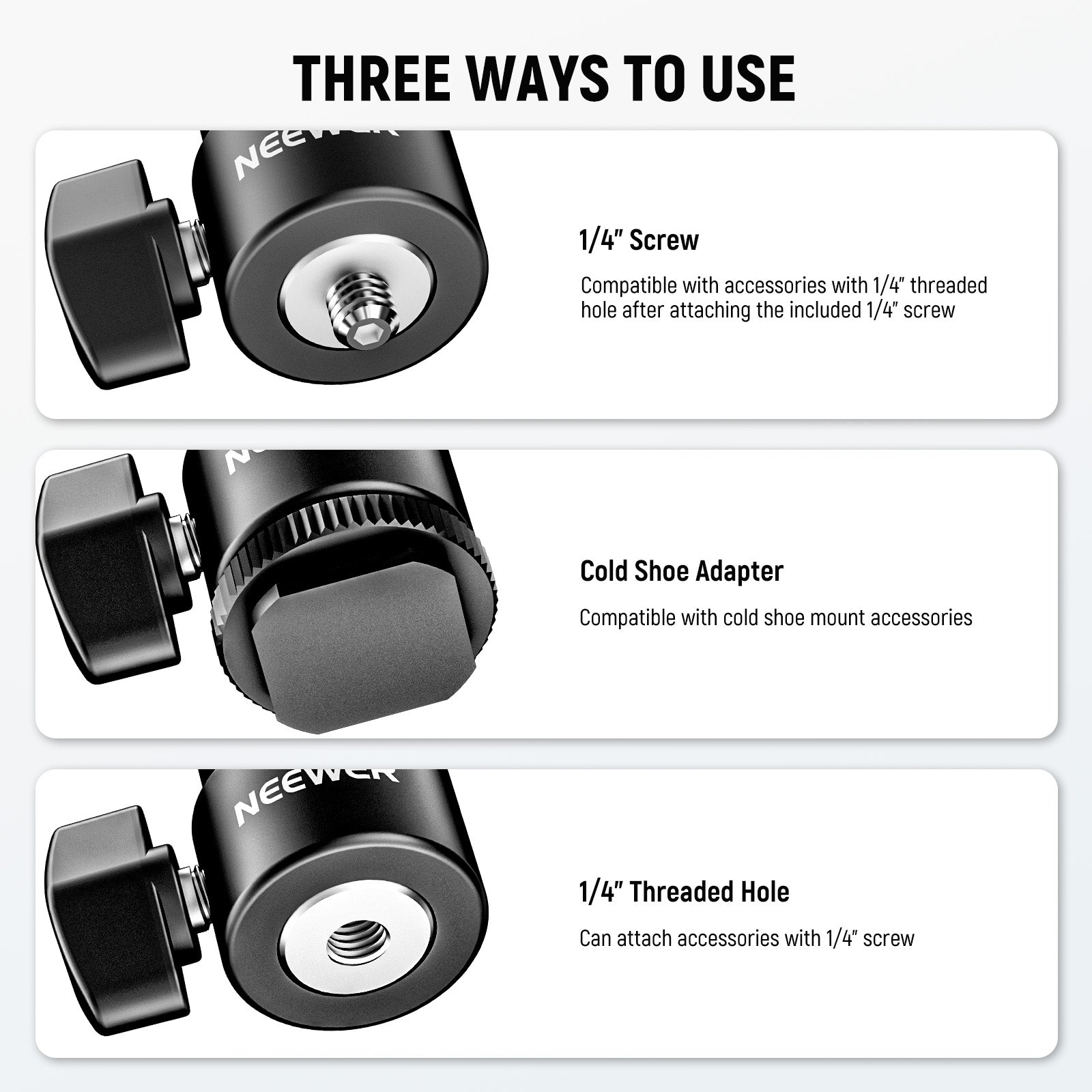 - Mini Rotule- Montez en toute sécurité sur votre appareil photo via l'adaptateur de chaussure froide. La vis 1/4" vous permet de monter une large gamme de dispositifs, tels que la lumière de remplissage LED, le flash LED, le moniteur de champ et d'autres accessoires avec un trou fileté 1/4". Le bouton de réglage verrouille fermement la rotule.