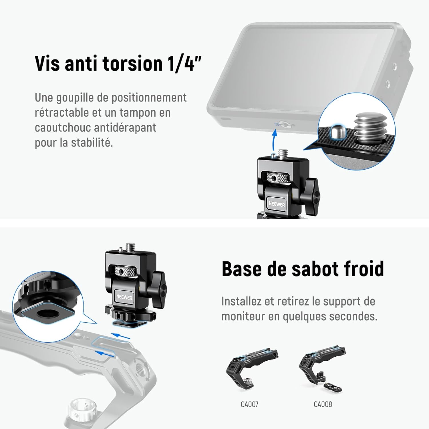 • 【Goupille de positionnement anti torsion rétractable】 Une goupille de positionnement anti torsion rétractable est compatible avec Atomos Ninja V, Ninja V+, et d'autres moniteurs avec des trous de positionnement ou des moniteurs comme NEEWER F100/F200 sans trous de positionnement. Le tampon en caoutchouc antidérapant augmente la stabilité et offre une protection contre les rayures.