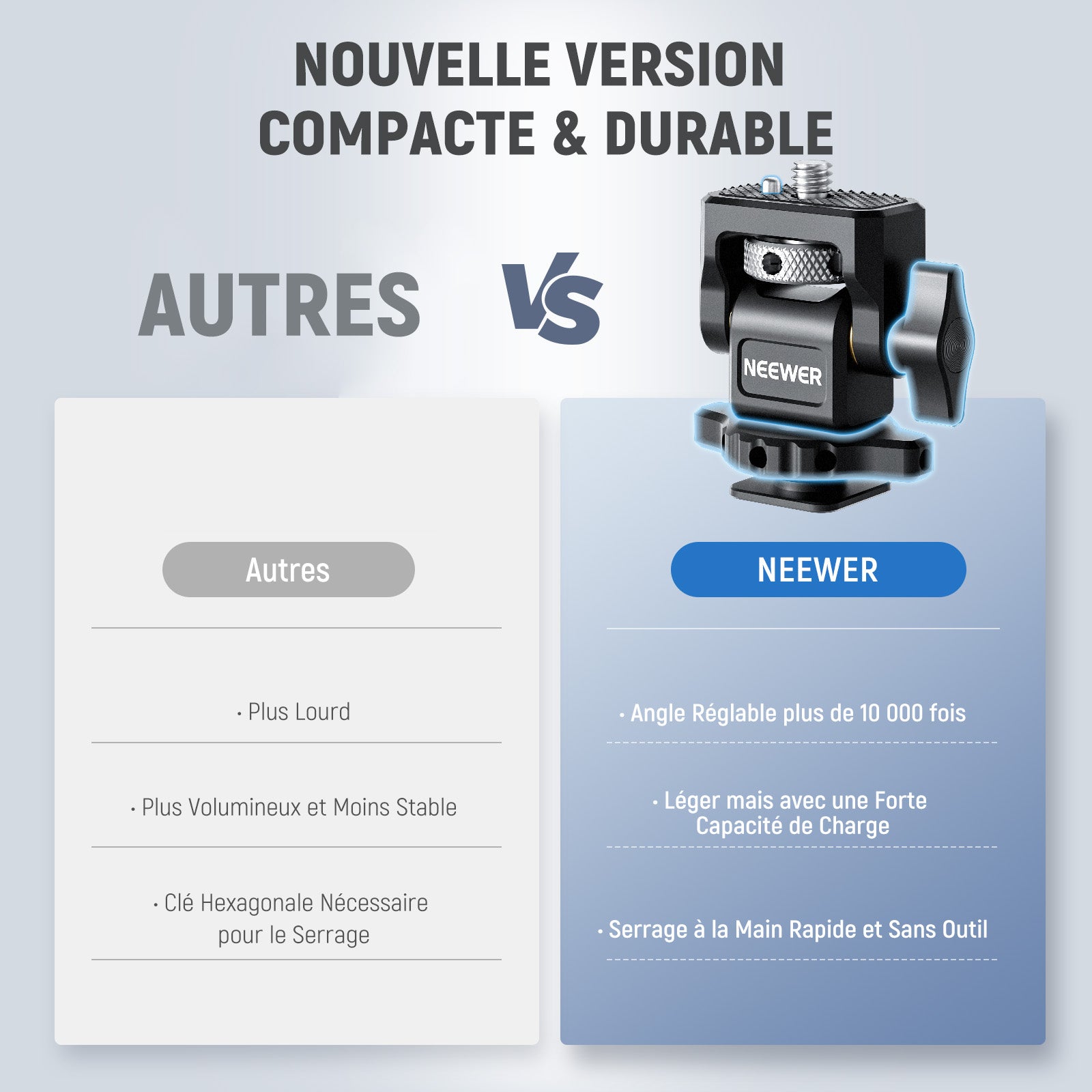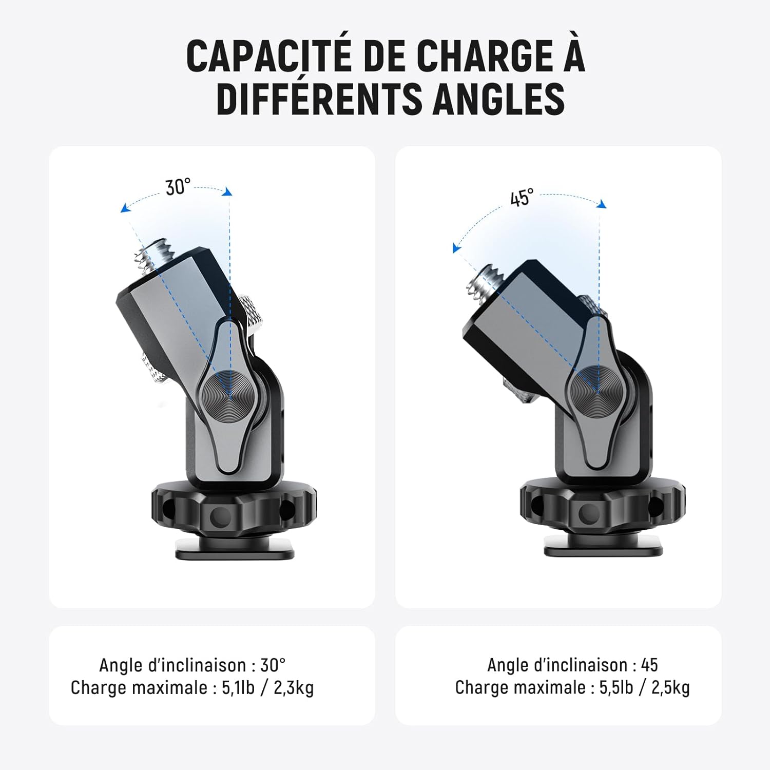 • 【Capacité de charge plus importante à différents angles】 Doté d'une plus grande capacité de charge à différents angles, il supporte jusqu'à 10,4lb/4,7kg à une inclinaison de 30° et 7,3lb/3,3kg à une inclinaison de 45°. Que vous travailliez avec des équipements lourds ou des angles uniques, ce support peut tout prendre en charge.