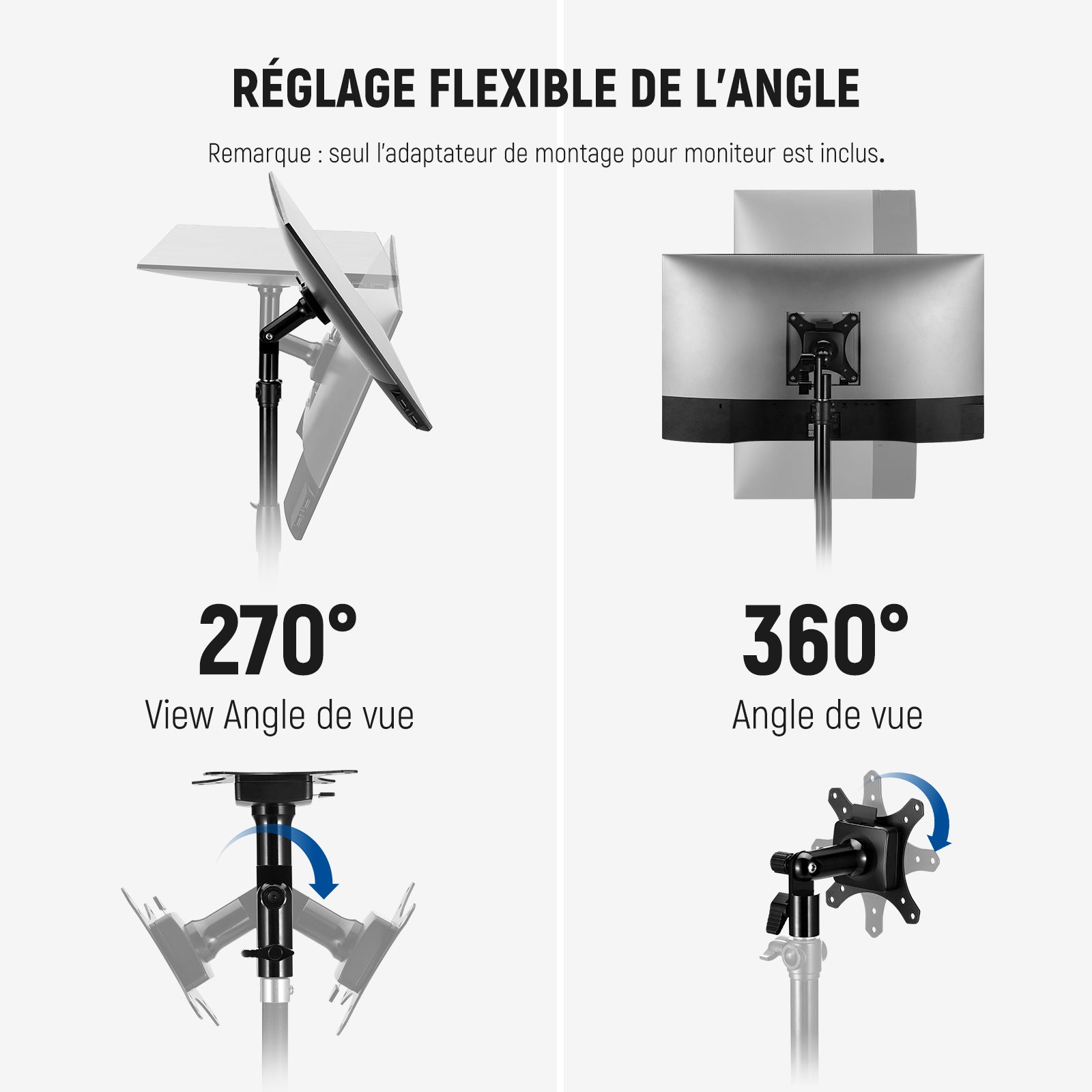 - 【Trou de montage universel de 5/8"】l'adaptateur de support en tant que bras VESA dispose d'un support standard de 5/8" et d'une vis à oreilles, offrant une compatibilité transparente et stable avec la plupart des supports d'éclairage et des supports C pour les besoins d'affichage de divers endroits. Ajustez l'angle jusqu'à 270° grâce au bouton rotatif en fonction de vos préférences pour une expérience confortable