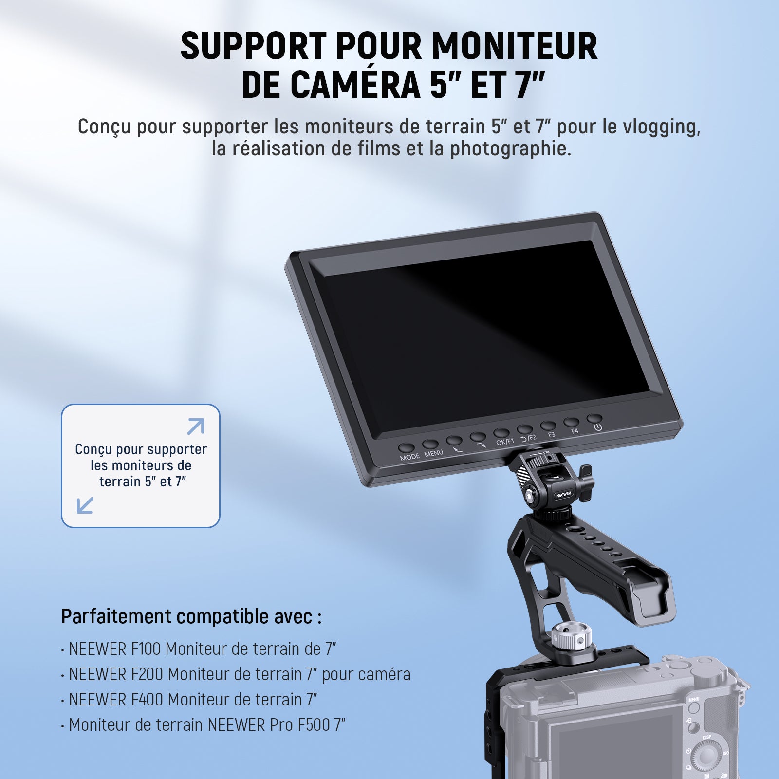 - 【Pour Moniteurs de Champ de 5" et 7"】 Conçu pour les moniteurs de champ de 5" et 7" pour caméra, ce support de moniteur pour griffe flash est compatible avec SmallRig et NEEWER cages de caméra, compatible avec Canon Sony Nikon Fujifilm Fuji appareils photo, les rigs vidéo, les poignées supérieures, les poignées latérales, les poignées pour stabilisateur et les griffes flash des appareils photo. Idéal pour les vlogs, les tournages de films et la photo