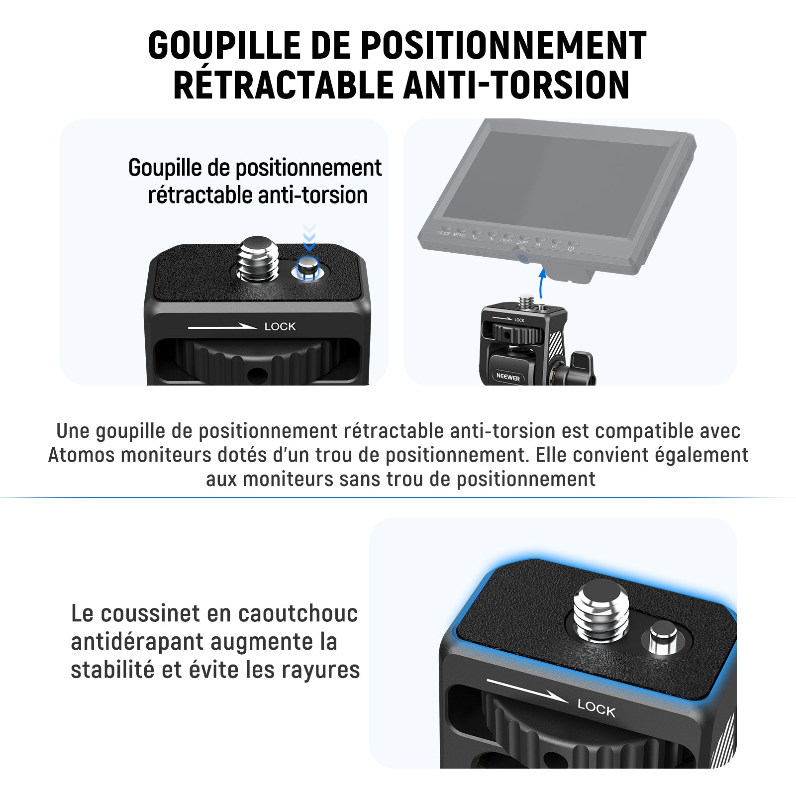 - 【Goupille de Positionnement Anti-Torsion Rétractable】 La goupille de positionnement anti-torsion rétractable est compatible avec Atomos Ninja V Ninja V+ moniteurs et d'autres moniteurs avec un trou de positionnement ou NEEWER F100 F200 F400 Pro F500 moniteurs sans trou de positionnement. Le patin antidérapant en caoutchouc améliore la stabilité et empêche les rayures