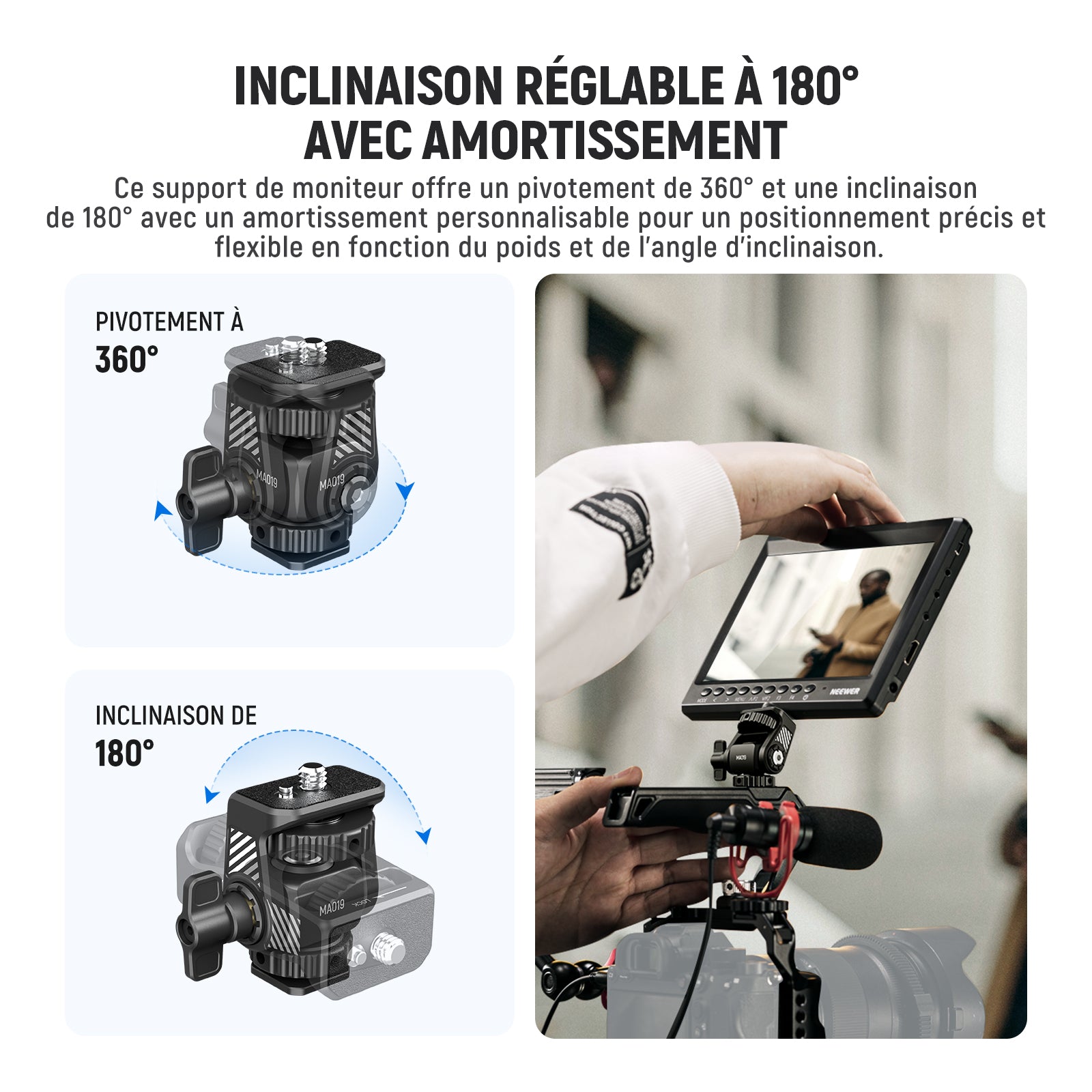 - 【Rotation 360° & Inclinaison 180° Réglables】 Ce support de moniteur de champ pivote sur 360° et s'incline à 180° avec un amortissement réglable pour le positionner de manière précise et personnalisée selon le poids et l'angle d'inclinaison. La molette sur le côté permet de le régler rapidement à la main