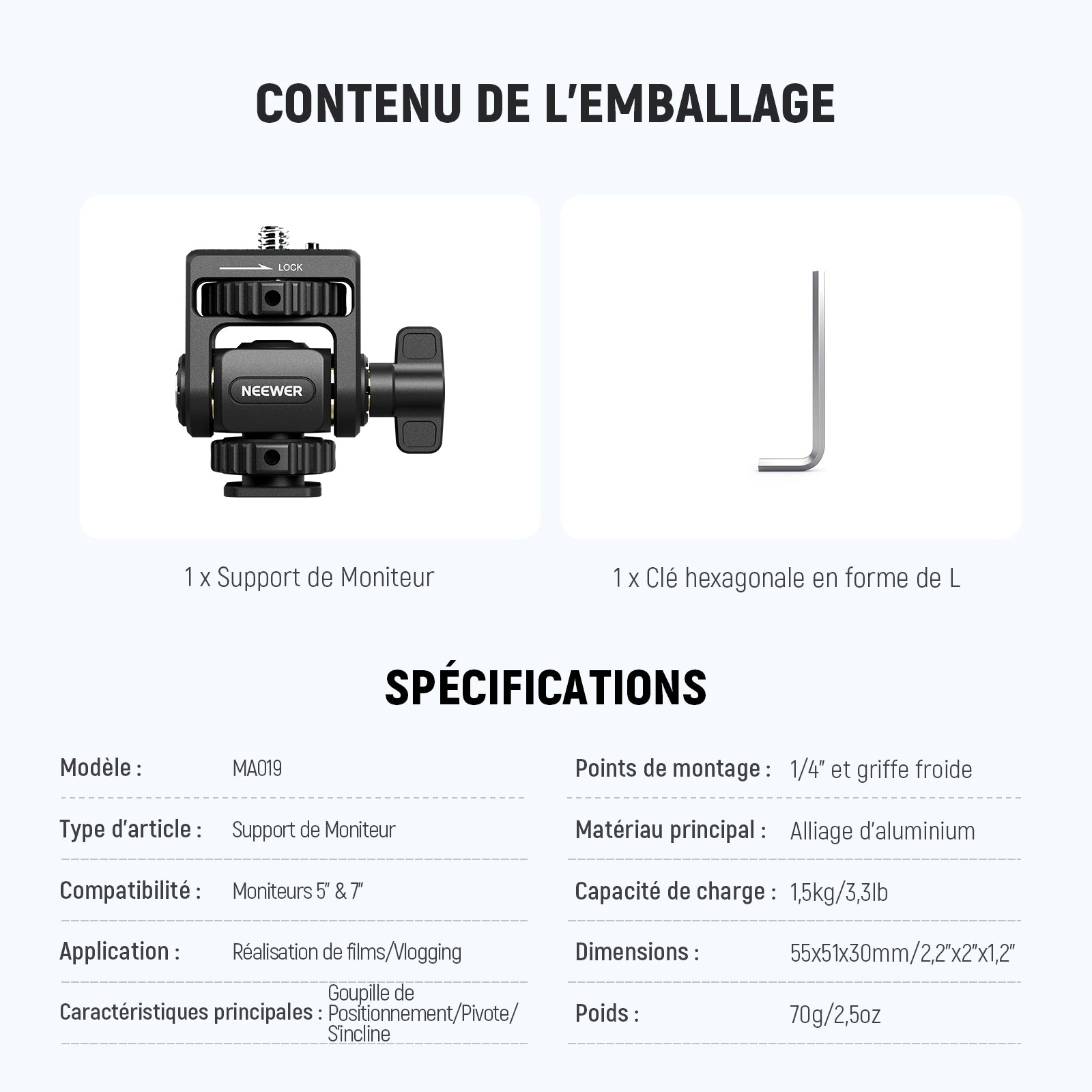 - 【Construction Solide en Alliage d'Aluminium】 Fabriqué en alliage d'aluminium de qualité supérieure, ce support pour moniteur de caméra possède une capacité de charge élevée de 1,5kg/3,3lb pour supporter de façon stable une vaste sélection de moniteurs
