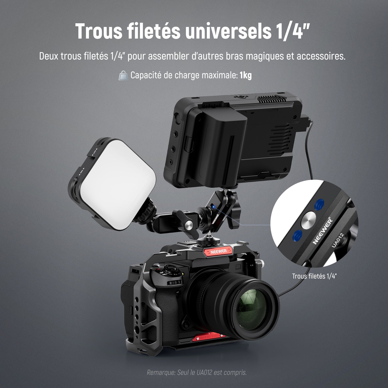• 【Vis universelles 1/4" et trous filetés】 Deux vis 1/4" peuvent fixer le bras magique à une cage de caméra, une poignée supérieure ou un trépied et monter un moniteur de terrain, une lumière de remplissage LED, un support pour smartphone, un microphone ou une caméra vlog en même temps. Le bras magique dispose également de deux filetages 1/4" pour connecter d'autres bras magiques et accessoires.