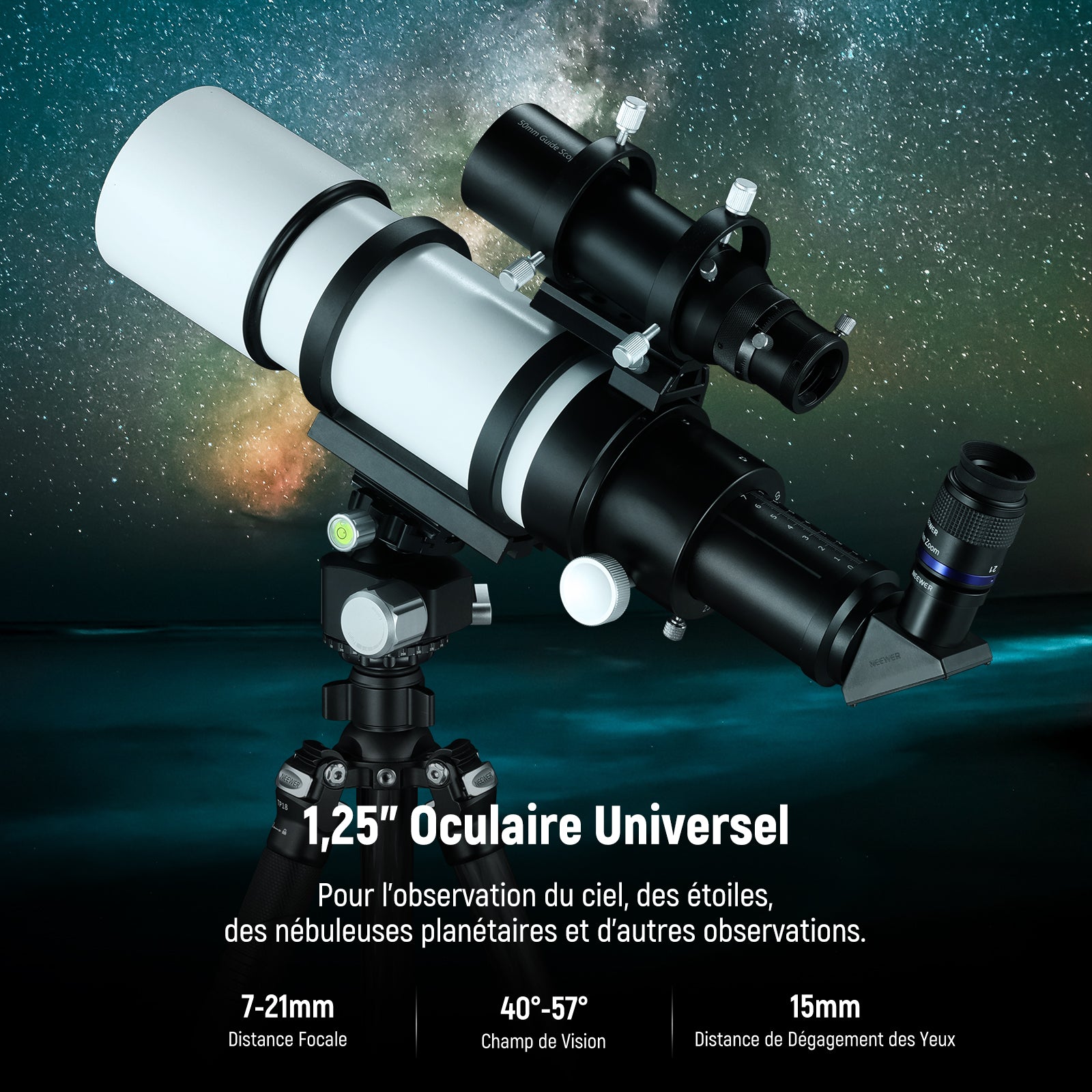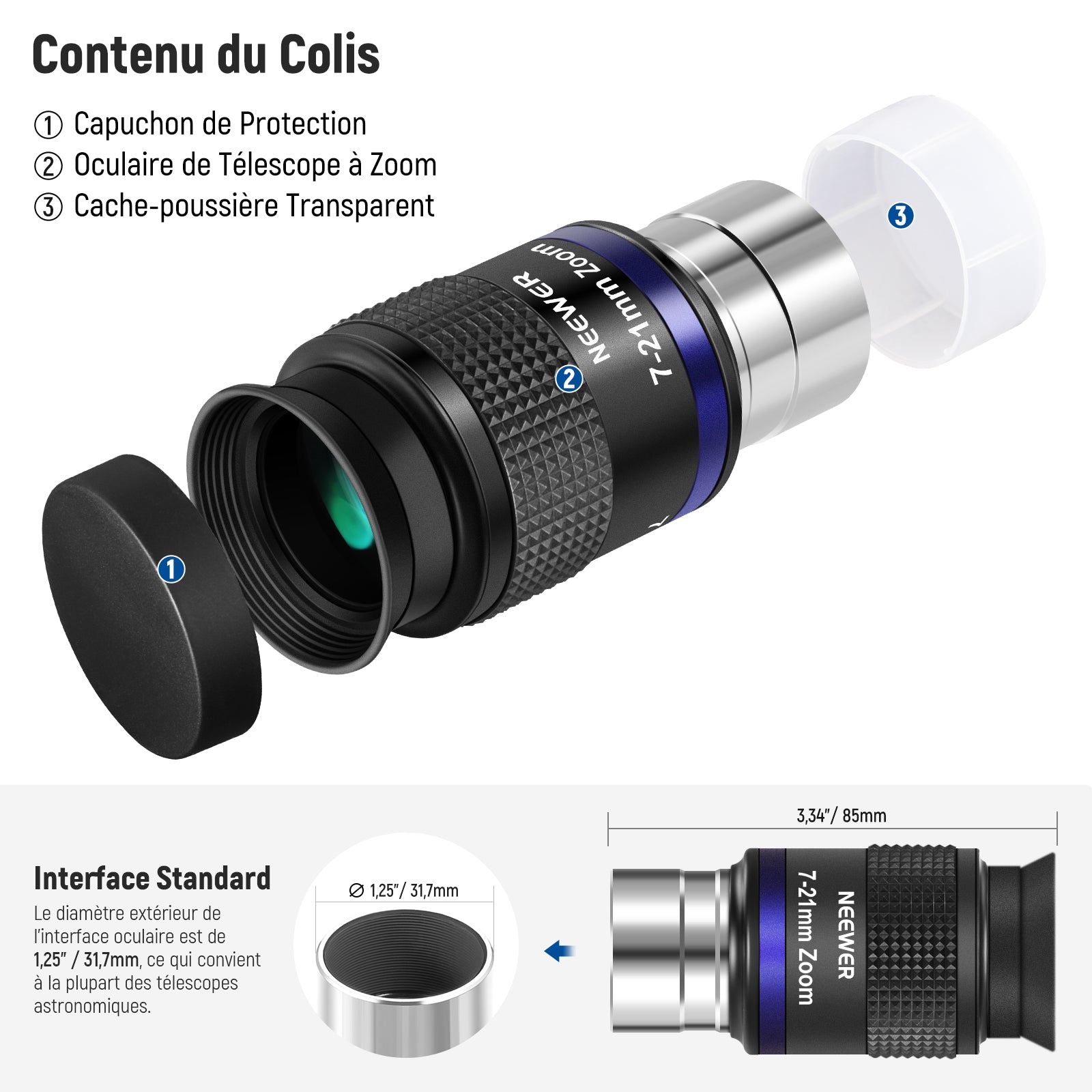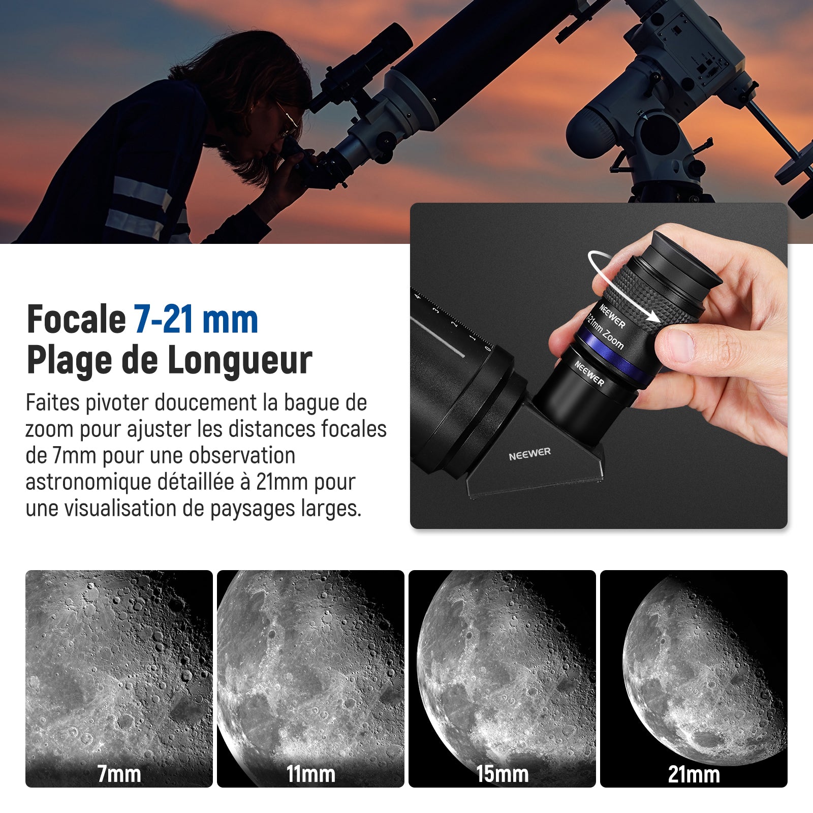 - 【Plage de longueur focale de 7 à 21mm】 Faites pivoter doucement la bague de zoom pour régler la distance focale de 7mm à 21mm. La large plage de focales permet une observation détaillée des planètes et des caractéristiques lunaires à fort grossissement (7mm) ou une visualisation large des paysages à faible grossissement (21mm) sans changer d'oculaire