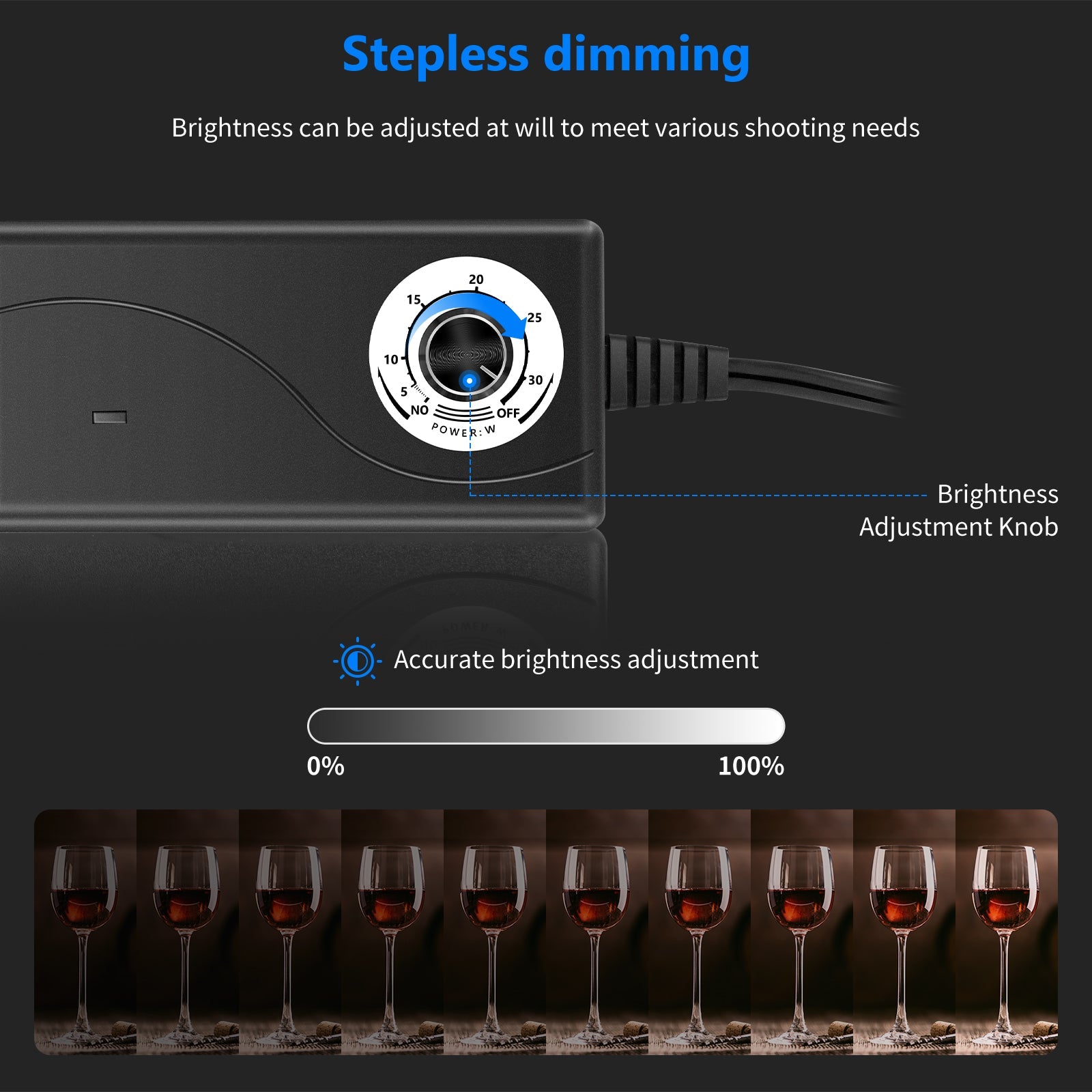 - LUMINOSITé RéGLABLE: équipé de 120 LED à intensité variable (4 bandes d'éclairage / 30 billes LED sur chaque bande), la luminosité de la lumière peut être réglée progressivement et de manière constante à l'aide du bouton rotatif. La température de couleur de 5500K, 21100 lumens et le CRI élevé fournissent une source de lumière adéquate pour une photo de qualité
