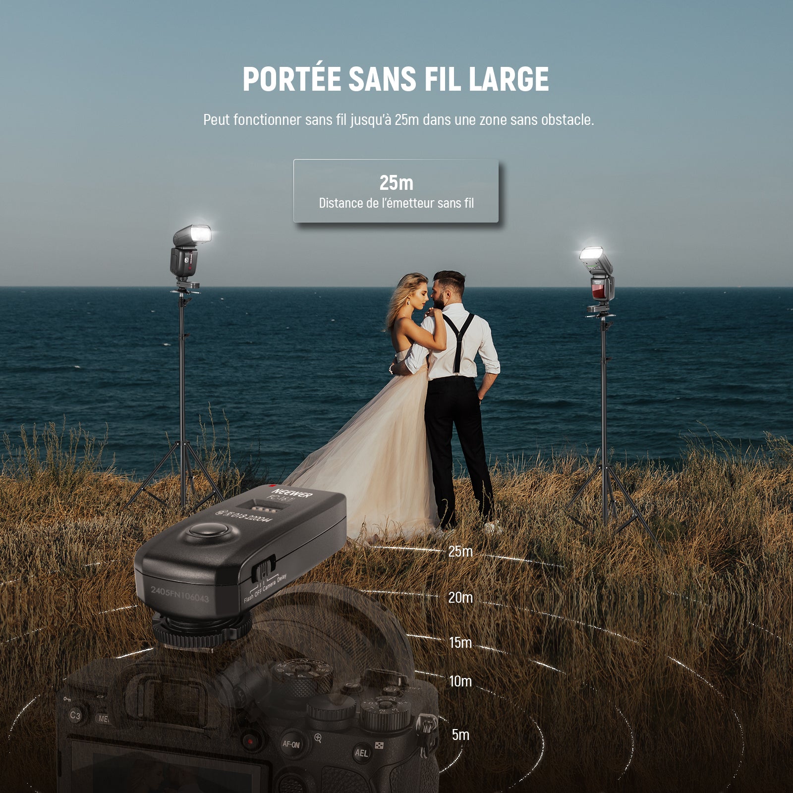 - Connexion à distance multicanal 2,4 GHz- Le kit récepteur de déclenchement de flash à distance fonctionne sur une fréquence sans fil fiable de 2,4 GHz avec 16 canaux sélectionnables et une vitesse de synchronisation du flash jusqu'à 1/200 s dans un rayon de 25m, garantissant une connexion stable et sans interférence entre vos flashs et votre appareil photo reflex numérique. Ne prend pas en charge le mode TTL/HSS