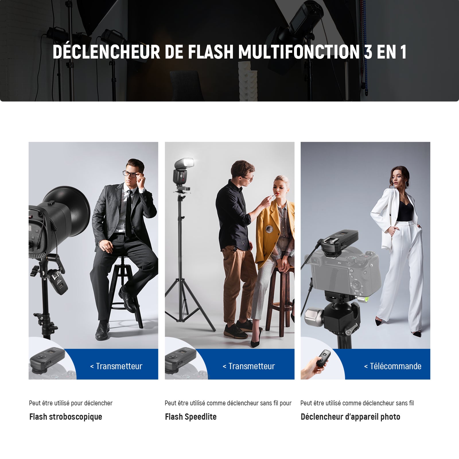 - Transmetteur de flash multifonction 3 en 1- Cet émetteur de déclenchement de flash à distance peut être utilisé comme (1) flash stroboscopique de studio à déclenchement synchrone sans fil, tel que le flash NEEWER S101-300W S101-400W S101-400W PRO Q300; (2) Il peut être utilisé comme flash Speedlite à déclenchement sans fil; (3) Il peut également être utilisé comme déclencheur d'appareil photo sans fil