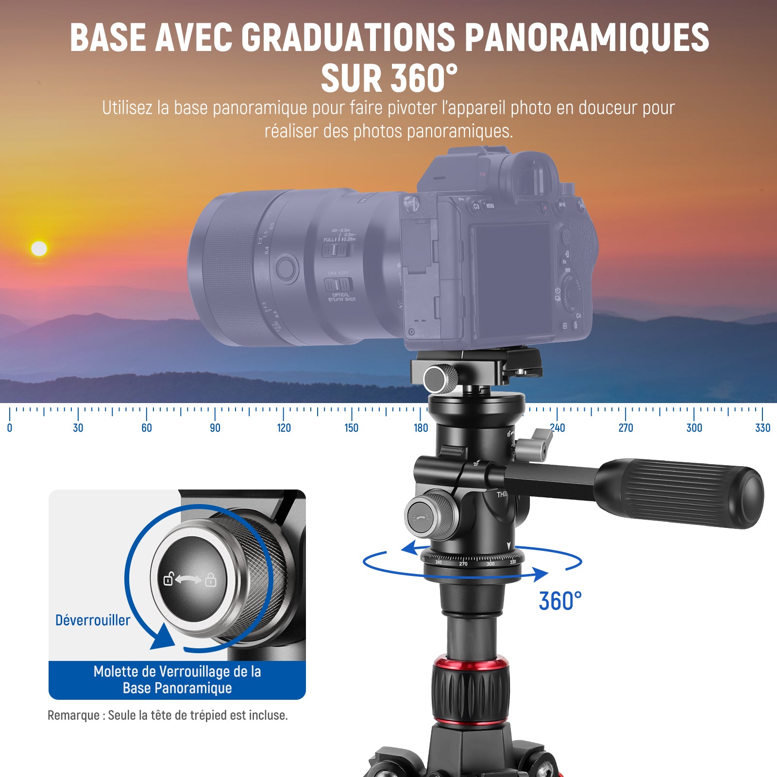 - 【Base Panoramique avec Graduations sur 360°】 Utilisez la base panoramique professionnelle pour faire pivoter en douceur l'appareil photo et réaliser des photos et des vidéos panoramiques. Les graduations sur 360° vous aident à faire tourner l'appareil photo avec une grande précision et une molette permet de bloquer solidement l'appareil photo en position.