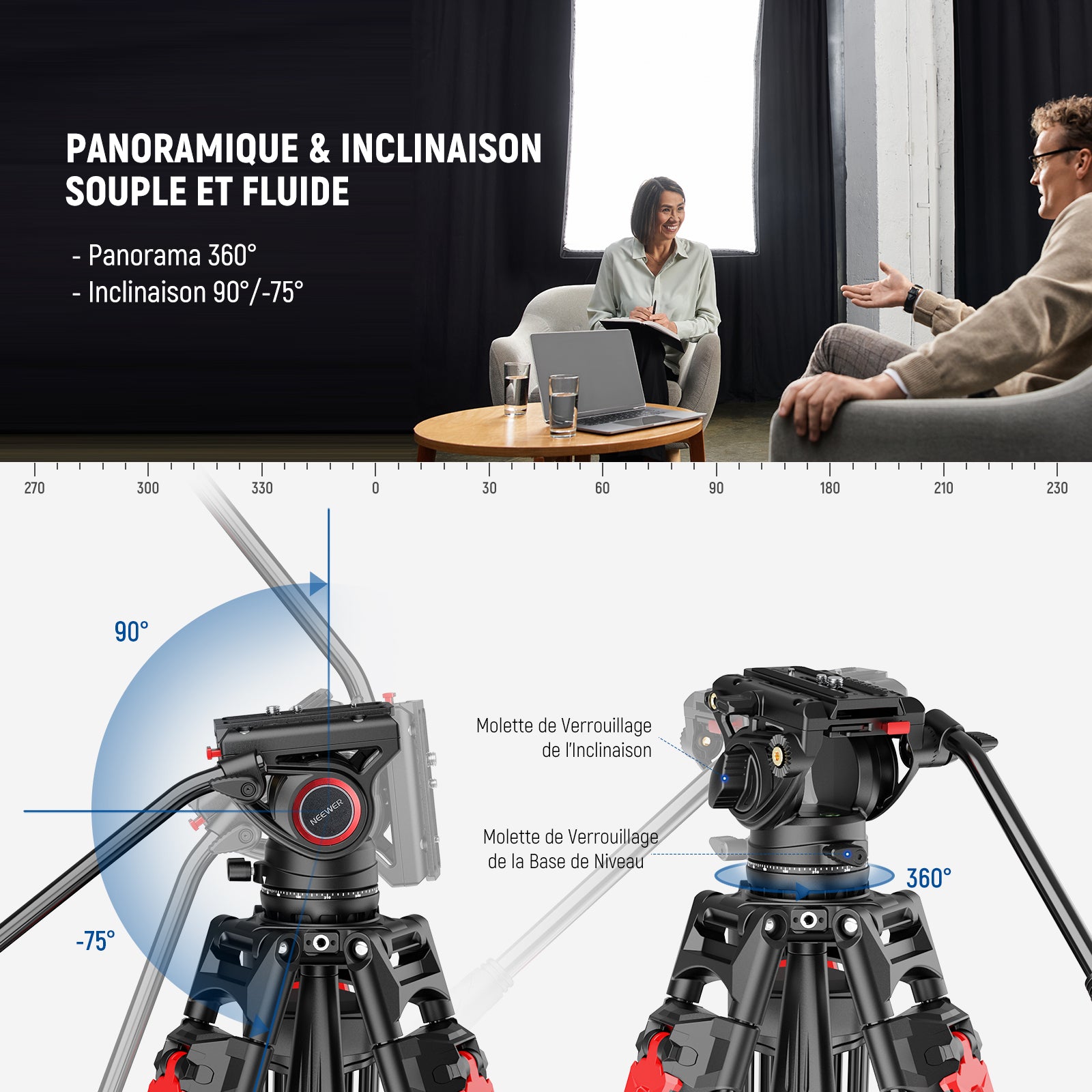 - Tête de poêle fluide de qualité supérieure : le trépied professionnel dispose d'une tête fluide avec un système d'amortissement de friction et d'équilibrage fluide. Prend en charge la rotation à 360° et le mouvement d'inclinaison de -75°/+90°. La base du bol de 75 mm de diamètre avec échelle à 360° et une poignée de verrouillage pour des images panoramiques nettes avec fluidité. Un niveau à bulle pratique aide à garder le niveau droit tout le temps.