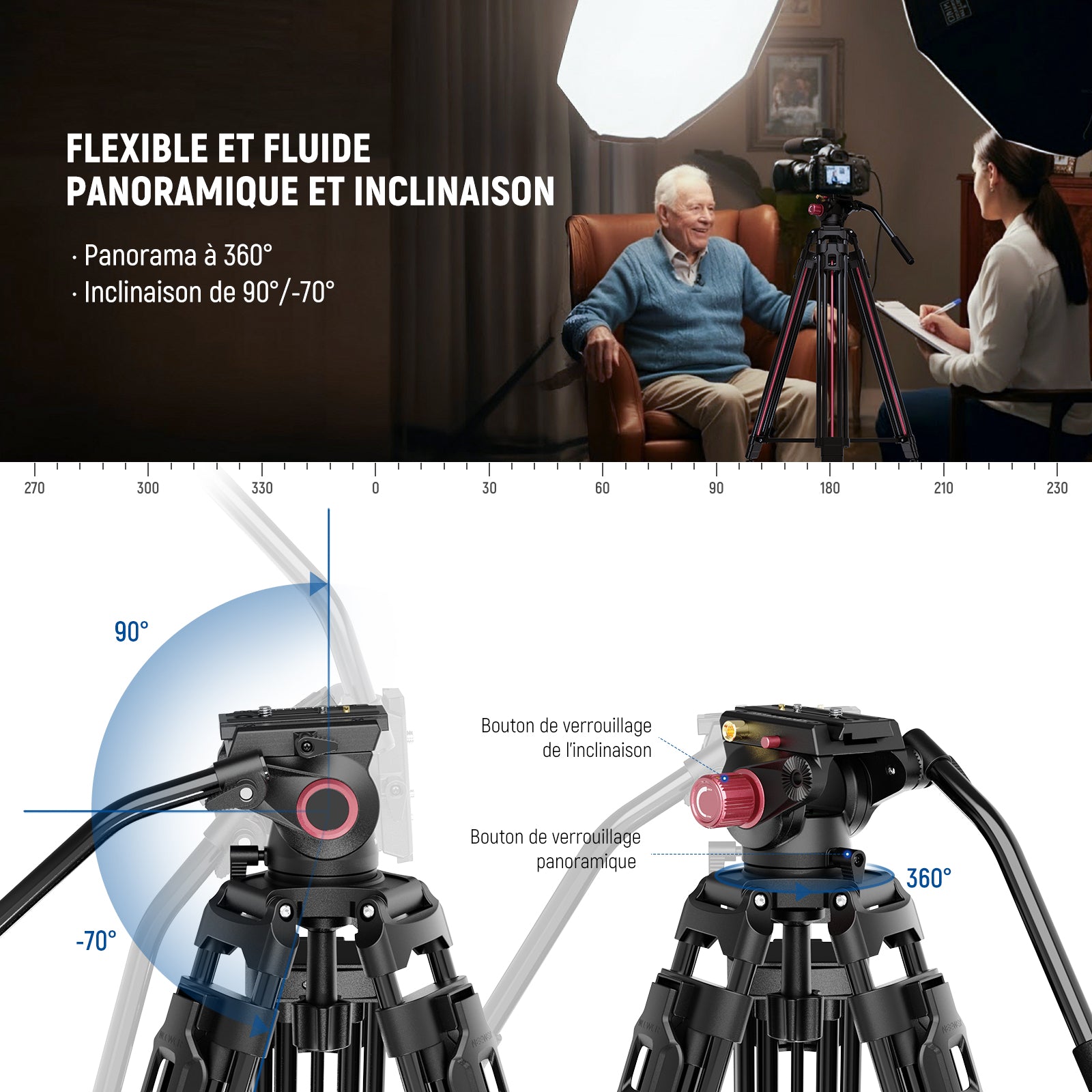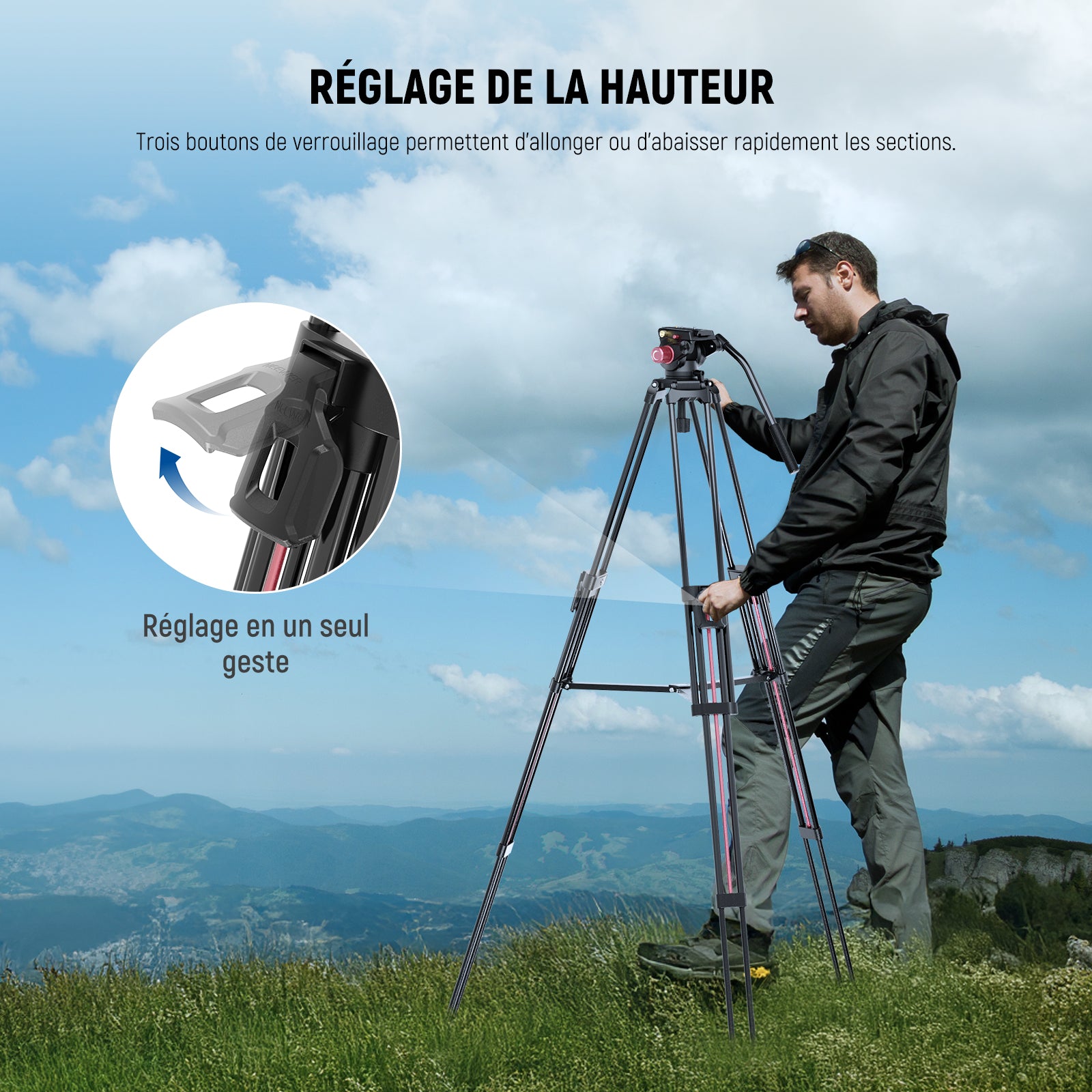 - Tête fluide à nivellement rapide : la tête fluide pivote horizontalement à 360° et s'incline verticalement de -70° à 90°, ce qui permet d'obtenir des angles de prise de vue plus polyvalents pour chaque résultat de prise de vue. La base de la coque de 70 mm au bas de la tête du trépied peut être ajustée pour la maintenir stable sur un terrain accidenté. Le niveau à bulle intégré garantit que ce trépied haut est bien équilibré et bien placé en toute sécurité