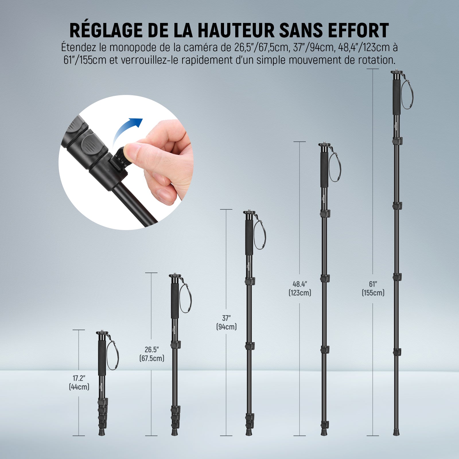 - 【Réglage de la hauteur sans effort】 Étendez le monopode de l'appareil photo de 67,5 cm, 94 cm, 123 cm à 155 cm et verrouillez-le rapidement d'un simple mouvement. Que vous preniez des photos à un angle bas ou pour une vue panoramique étendue, vous pouvez vous ajuster de manière flexible pour obtenir la meilleure photo.