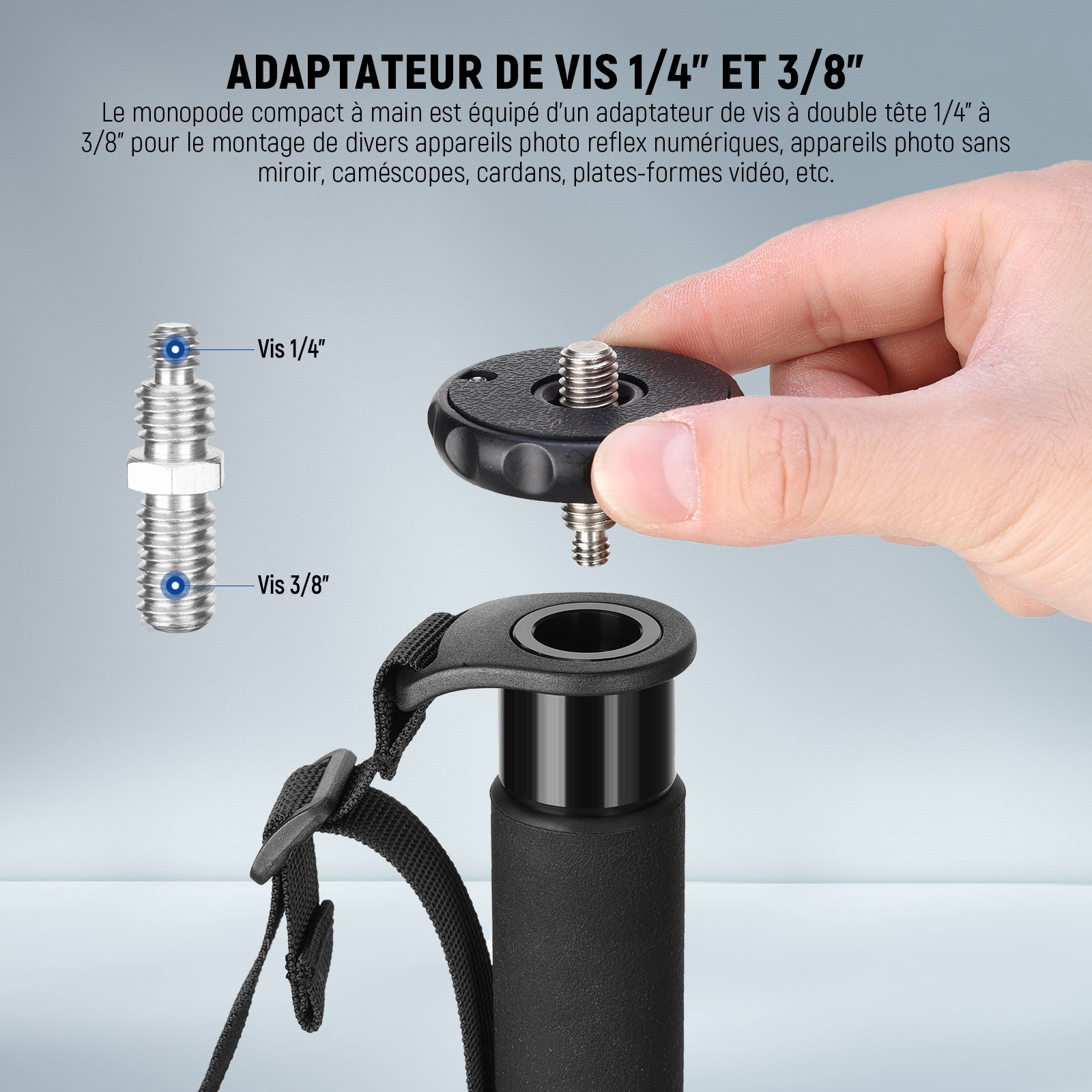 - 【Adaptateur de vis 1/4" et 3/8"】 Le monopode compact portable est équipé d'un adaptateur de vis à double tête 1/4" à 3/8" pour le montage de divers appareils photo reflex numériques, appareils photo sans miroir, caméscopes, cardans, plates-formes vidéo, etc., compatible avec Sony Canon Nikon, compatible avec Insta360 compatible avec les caméras d'action DJI, pour les adaptateurs de montage compatibles avec GoPro, pour les supports de téléphone compatibles avec iPhone Téléphones portables Android, autres équipements de photographie et de vidéographie, engrenages ou accessoires