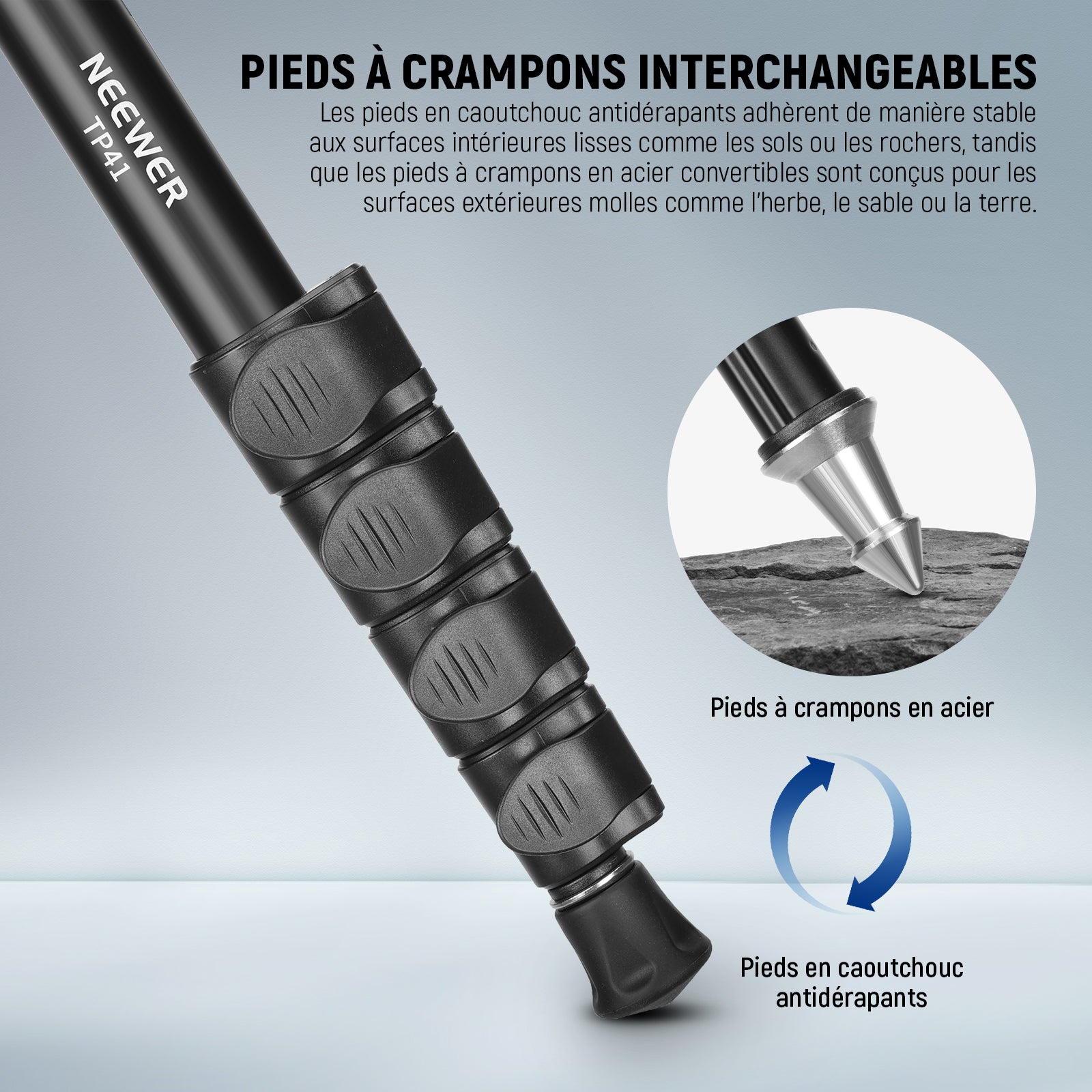 - 【Pieds à pointes interchangeables】 Les pieds en caoutchouc antidérapants adhèrent de manière stable aux surfaces lisses intérieures comme les sols ou les rochers, tandis que les pieds à pointes en acier convertibles sont conçus pour les surfaces extérieures molles telles que l'herbe, le sable ou la terre. La conception interchangeable de ce support de caméra est flexible et polyvalente pour différents scénarios de prise de vue