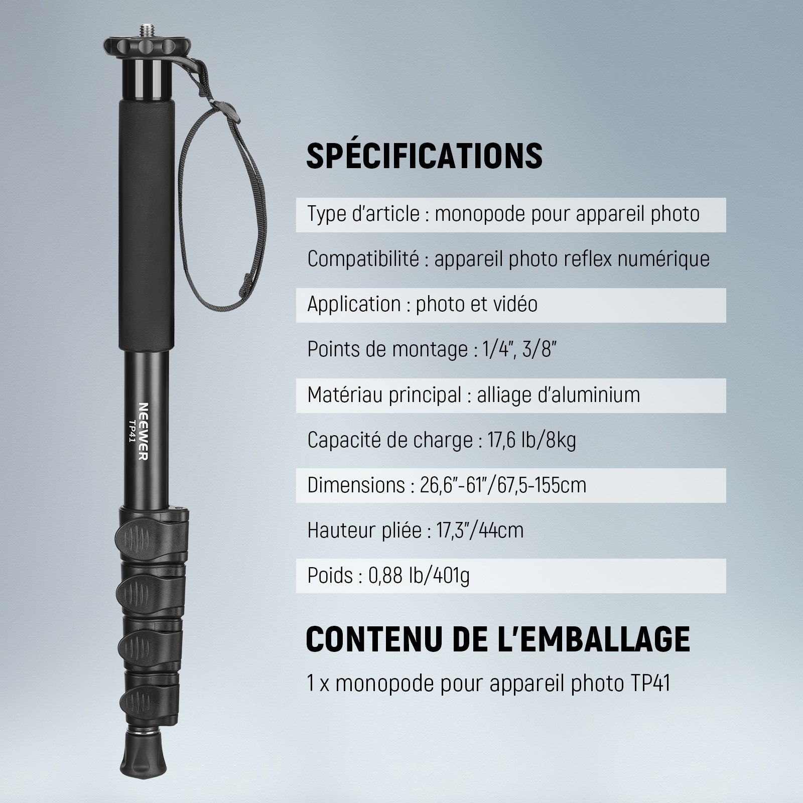 NEEWER TP41 Support de Monopod pour Appareil Photo 61"/155 cm