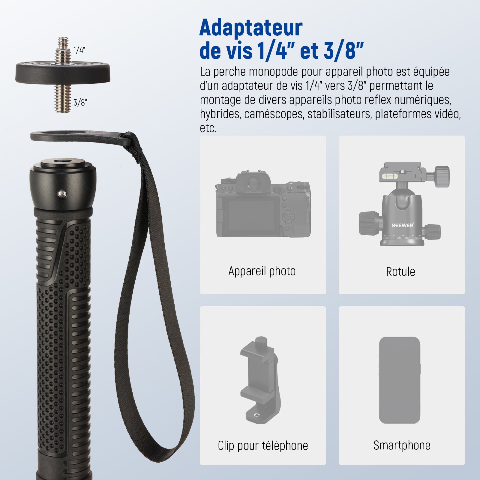 - 【1/4" & 3/8" Adaptateur de Vis】 Le bâton monopode de caméra possède un adaptateur à vis de 1/4" à 3/8" pour monter divers caméras DSLR, caméras sans miroir, caméscopes, gimbals, rigs vidéo, etc, compatible avec Sony Canon Nikon caméras, compatible avec Insta360 compatible avec DJI caméras d'action, pour monter les adaptateurs compatibles avec GoPro, pour les supports de téléphone compatibles avec iPhone Android téléphones, autre équipement de photographie, des dispositifs, ou des accessoires