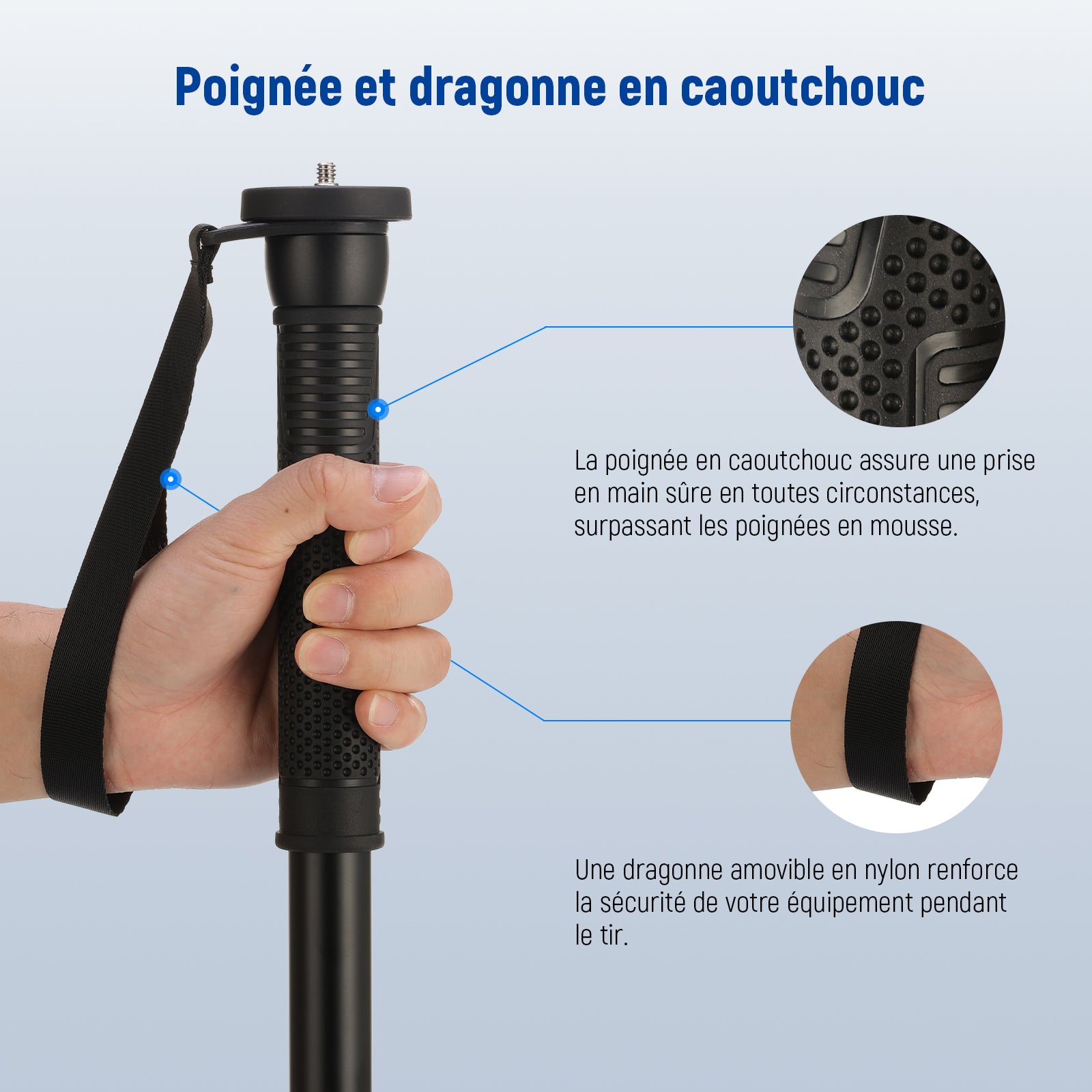 - 【Poignée en Caoutchouc & Sangle de Poignet】 La poignée en caoutchouc est conçue pour éviter de glisser, assurant une prise ferme dans toutes les conditions et une durée de vie plus longue que les poignées en mousse, qui peuvent se dégrader avec le temps. En outre, le monopode comprend une sangle de poignet en nylon amovible pour plus de sécurité, permettant de garder votre équipement en sécurité tout en capturant la prise de vue