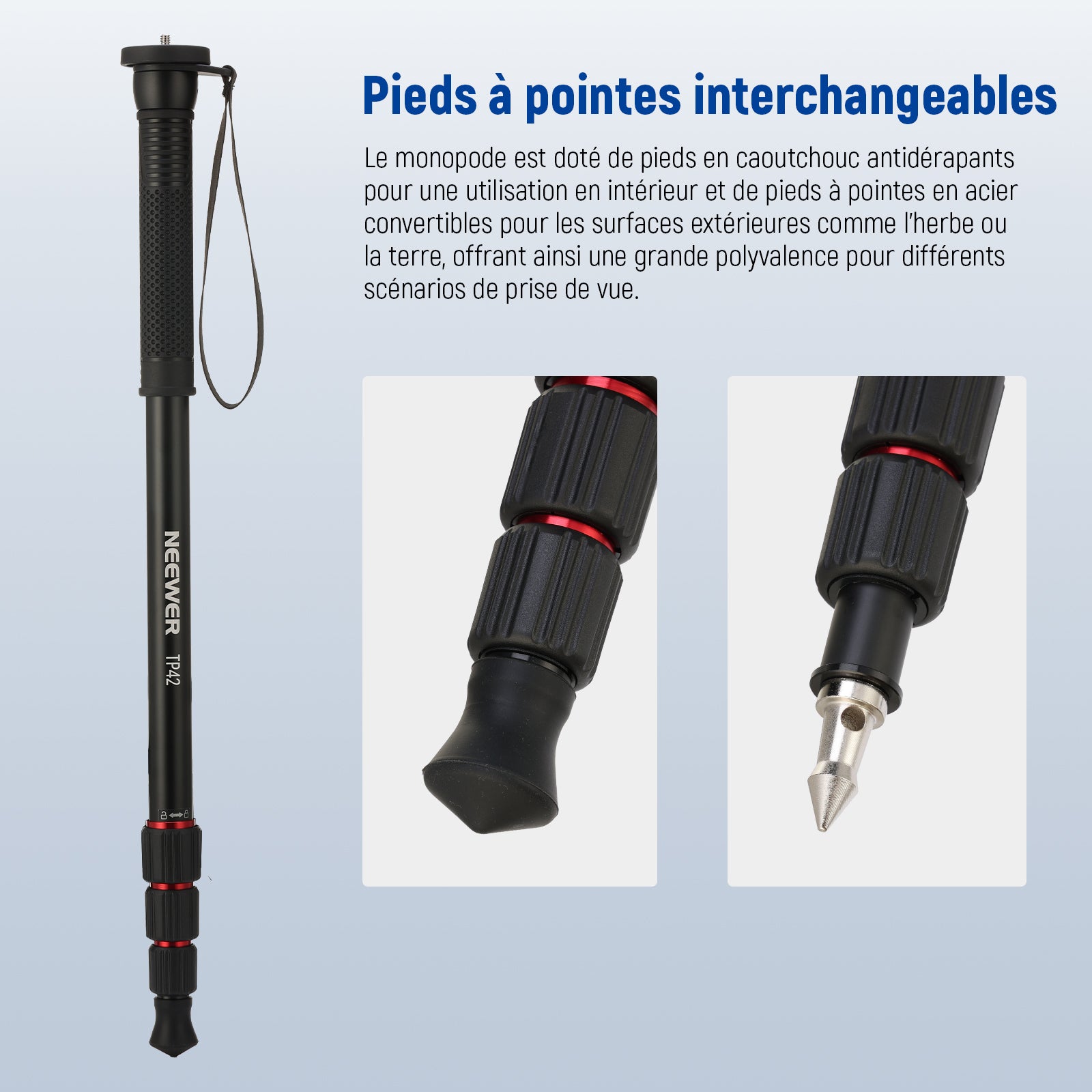 - 【Pieds à Pointes Interchangeables】 Ce monopode avec pieds en caoutchouc antidérapants s'agrippe de manière stable aux surfaces intérieures lisses telles que les sols ou les pierres, tandis que les pieds à pointes en acier convertibles sont conçus pour les surfaces extérieures souples telles que l'herbe, le sable ou la poussière. Le design interchangeable de ce support de caméra est flexible et polyvalent pour différents scénarios de prise de vue