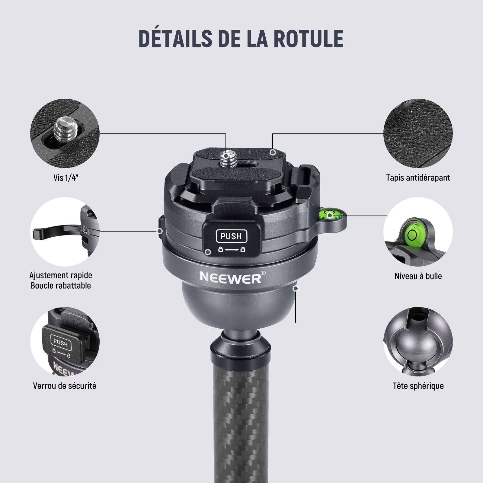 • 【Tête sphérique polyvalente et amovible à nivellement rapide】 La base à tête sphérique panoramique à 360° (⌀30mm) permet un nivellement rapide de +/-15° et deux fentes en U pour une inclinaison à 90°, facilement verrouillables avec une boucle rabattable. Il comprend un adaptateur à vis 1/4" à 3/8" et un adaptateur de base de montage pour trépied qui peut être fixé à l'axe central, permettant une utilisation interchangeable avec d'autres têtes de trépied.