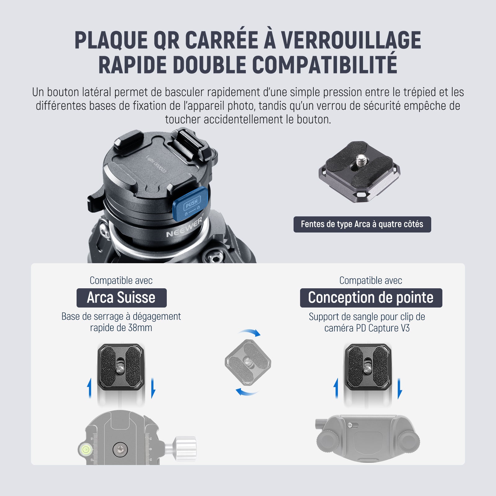 • 【Plaque QR carrée de type Arca à verrouillage rapide】 La plaque à dégagement rapide de type Arca est également compatible avec le clip de capture Peak Design PD V3. Un bouton latéral permet de basculer rapidement d'une simple pression entre le trépied et les différentes bases de fixation de l'appareil photo, tandis qu'un verrou de sécurité empêche tout contact accidentel avec le bouton. Remarque : pince QR compatible uniquement avec les plaques PD QR et les plaques de type Arca incluses.