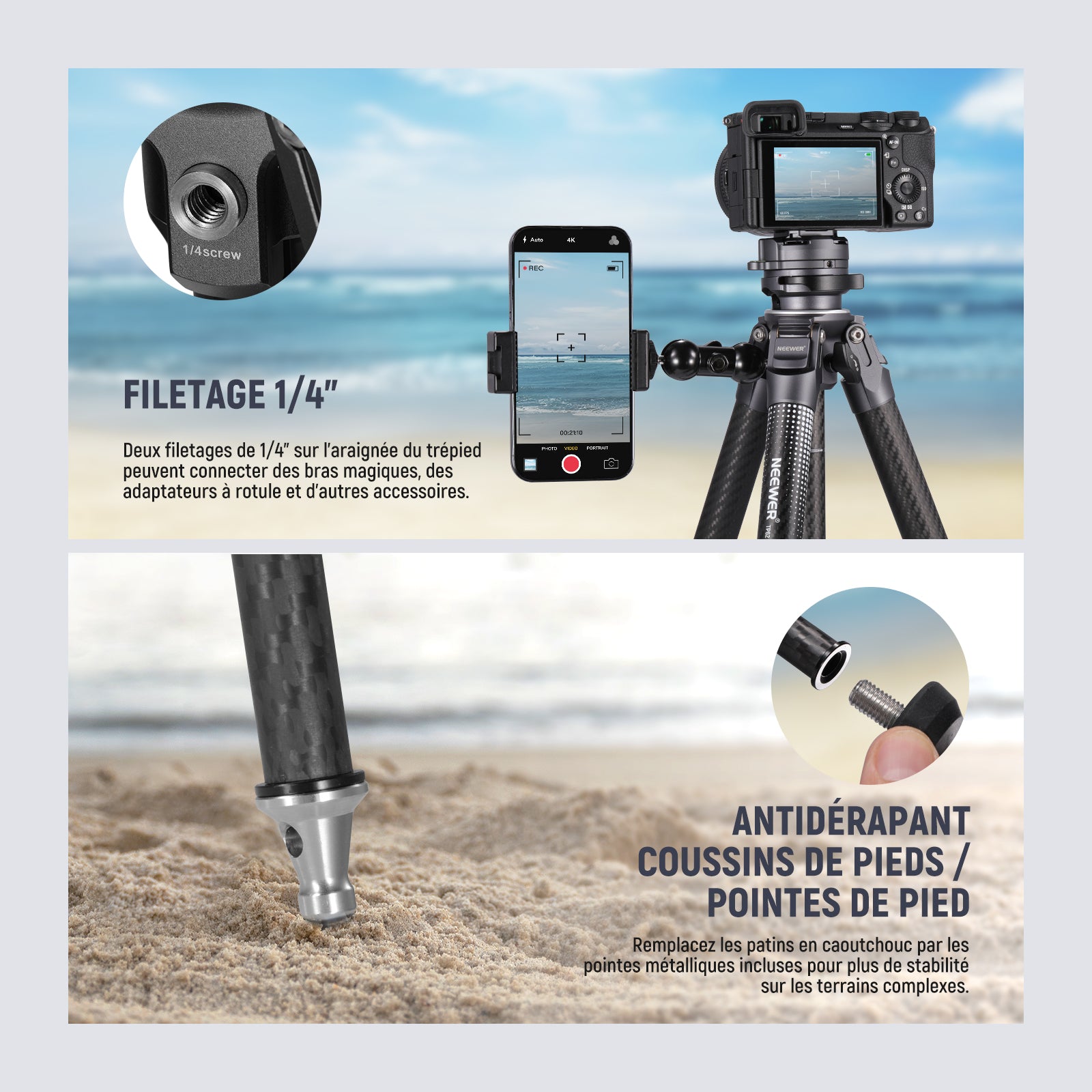 • 【Extension fonctionnelle et pointes】 La vis de montage 1/4" sur la plaque QR convient aux reflex numériques, caméscopes, supports de caméra d'action et supports de téléphone. Deux filetages 1/4" sur l'araignée du trépied peuvent connecter des bras magiques, des adaptateurs à rotule , et autres accessoires pour la création professionnelle. Les patins antidérapants sont amovibles pour installer des pointes, qui permettent au trépied de se stabiliser sur des terrains sablonneux, rocheux et boueux
