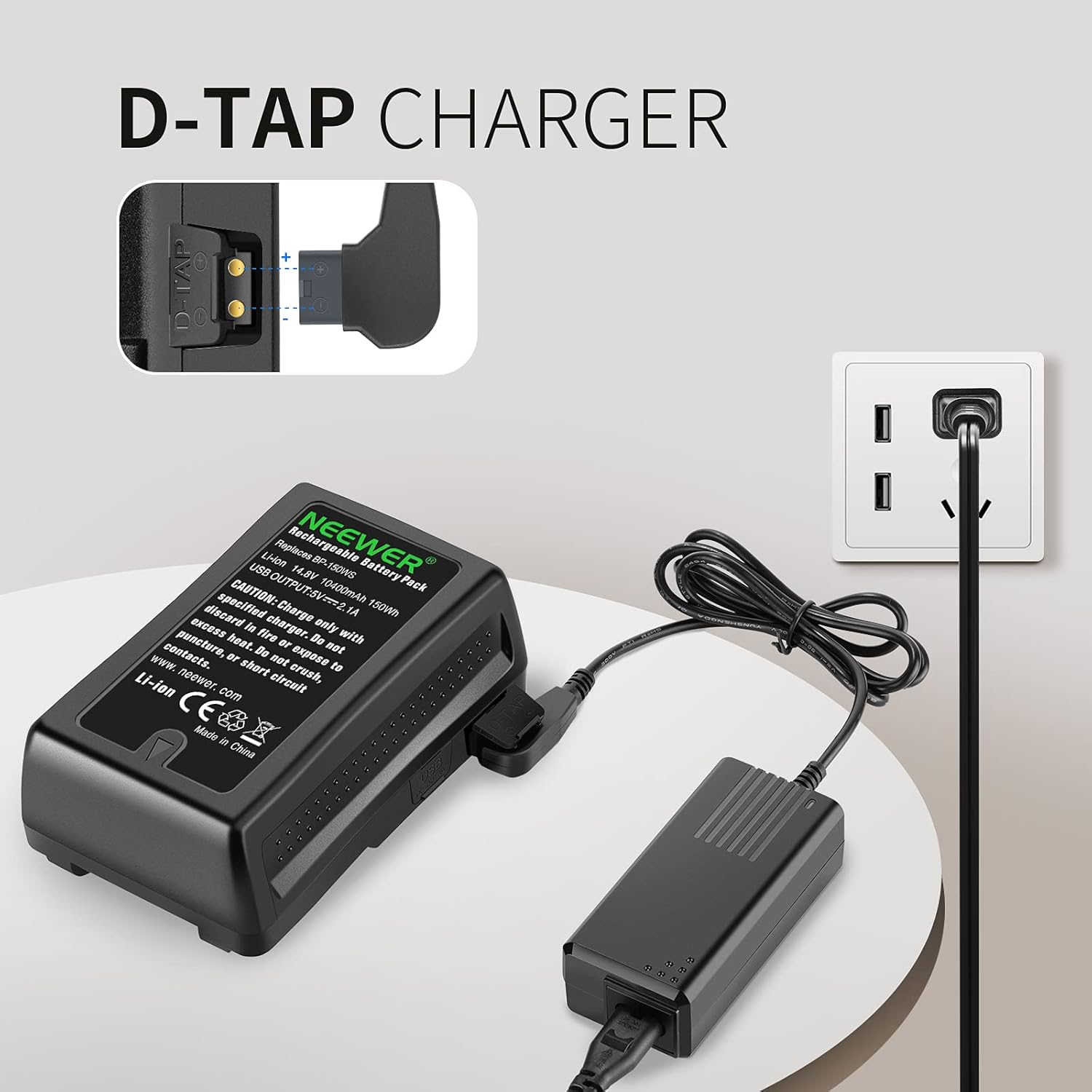 - La batterie V-Mount est livrée avec un port de charge D-Tap qui se connecte à l'adaptateur D-Tap inclus pour une charge rapide. Il dispose également d'un port USB 5V 2.1A utilisé pour charger votre smartphone, tablette et accessoires photographiques.