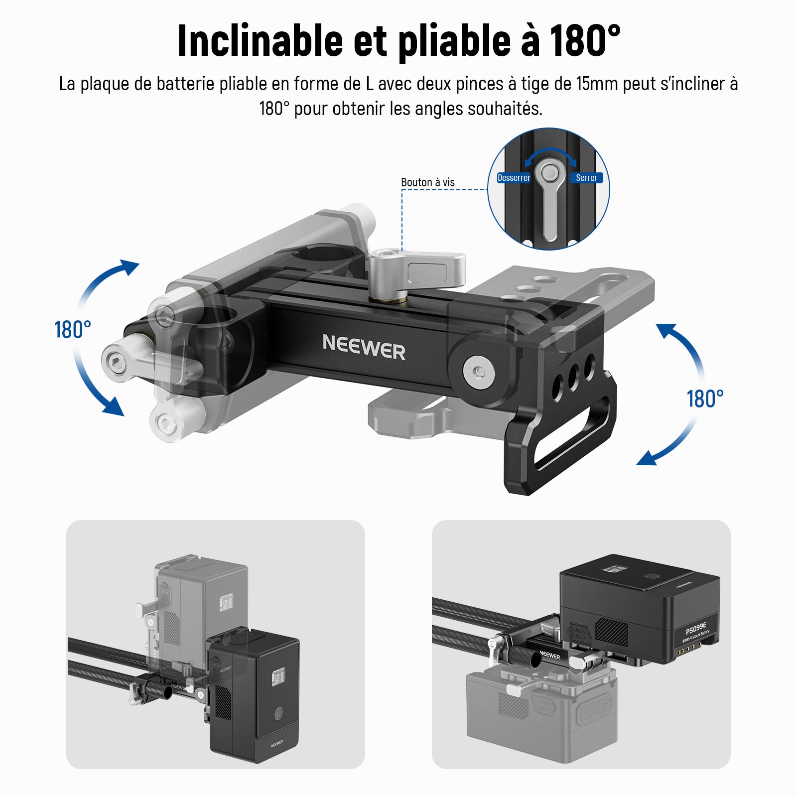 - 【Inclinable et pliable à 180°】 La plaque de batterie pliable en forme de L avec deux pinces à tige de 15mm peut s'incliner à 180° pour les angles souhaités, avec un bouton à vis qui contrôle leur tension d'inclinaison et les verrouille en place. Deux parties peuvent se plier à plat pour un rangement facile, offrant un accès dégagé à l'écran rabattable et aux autres opérations de l'appareil photo.