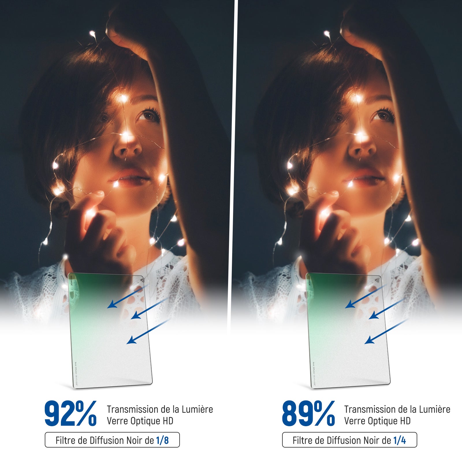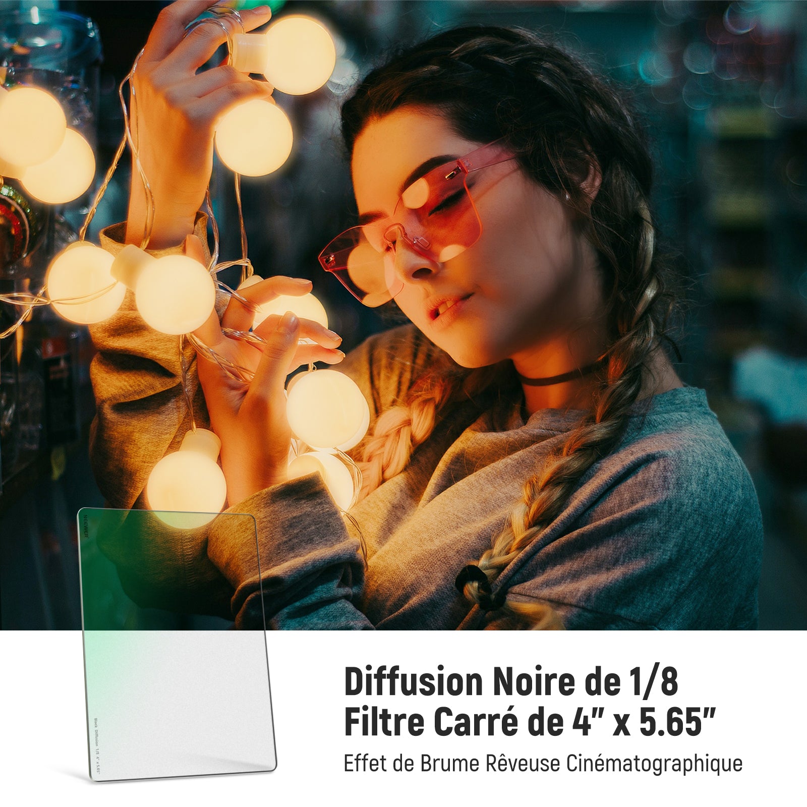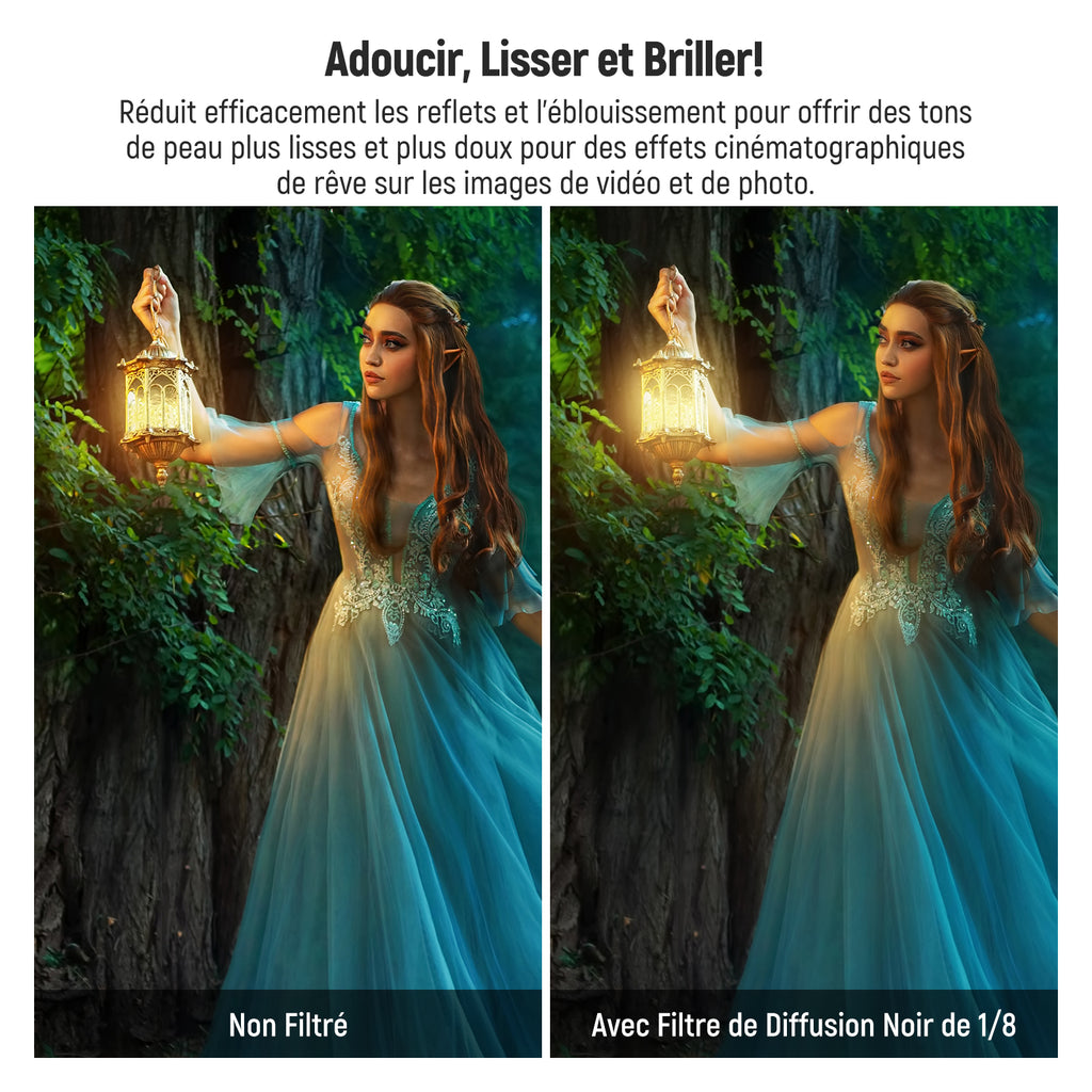 - Filtre de Diffusion Noire de 1/8 pour un Effet Cinématographique- Le filtre de diffusion noire de 1/8 d'arrêt réduit efficacement les reflets et réduit les reflets pour offrir un teint plus lisse et plus doux pour un effet cinématographique de rêve sur les images vidéo et photo. Idéal pour la photographie de portrait, l'enregistrement vidéo et le vlogging.