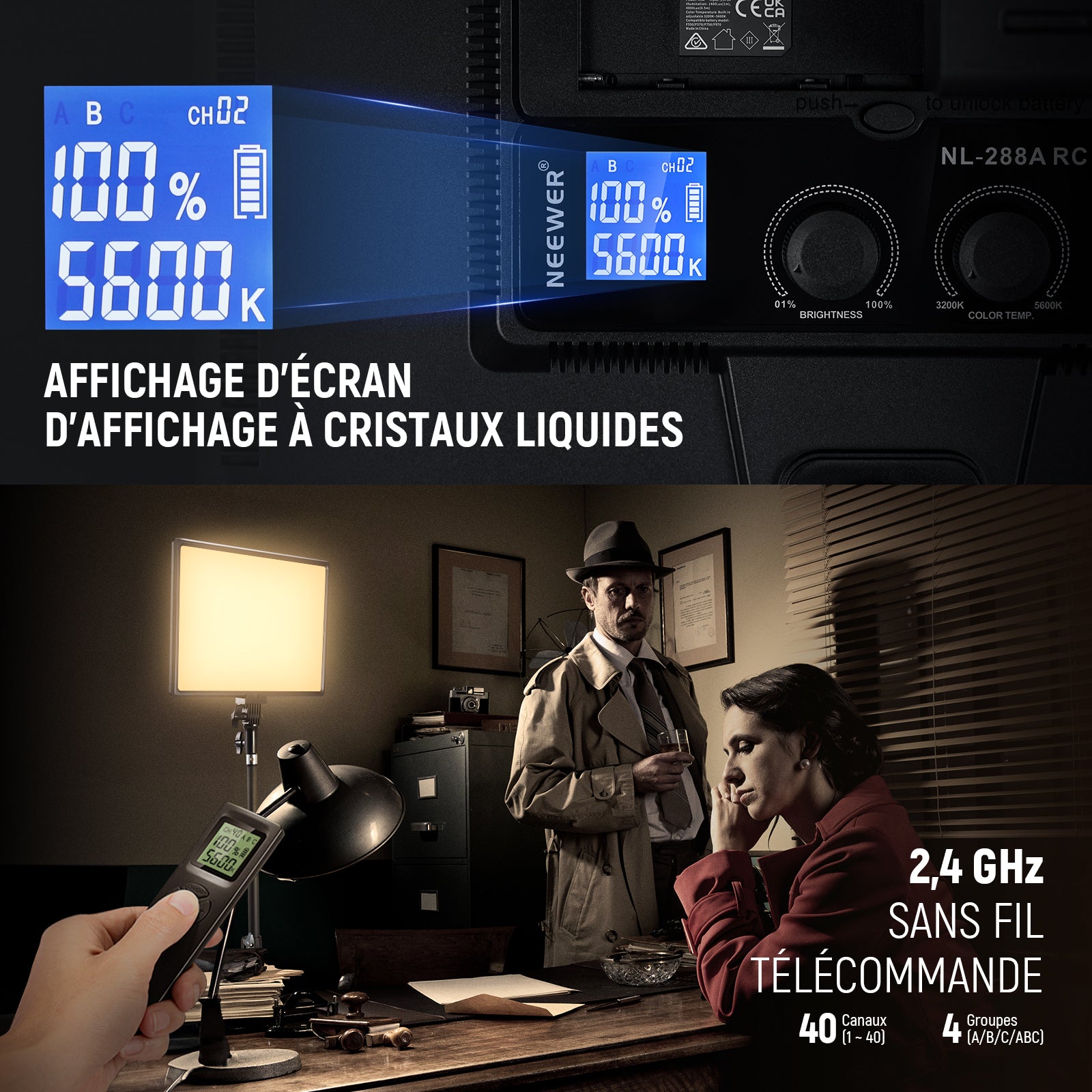 - Télécommande - Allumez/éteignez facilement la lumière, contrôlez les paramètres d'éclairage et basculez entre 40 canaux et 4 groupes (A/B/C/ABC) avec la télécommande 2,4GHz.