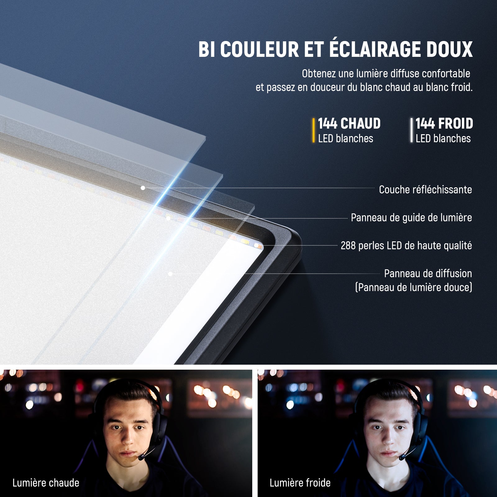 - Kit d'éclairage LED - Deux panneaux lumineux bicolores 288 LED avec deux supports d'éclairage stables en alliage d'aluminium offrent un éclairage doux, continu et sans scintillement pour la prise de vue vidéo et la diffusion en direct.