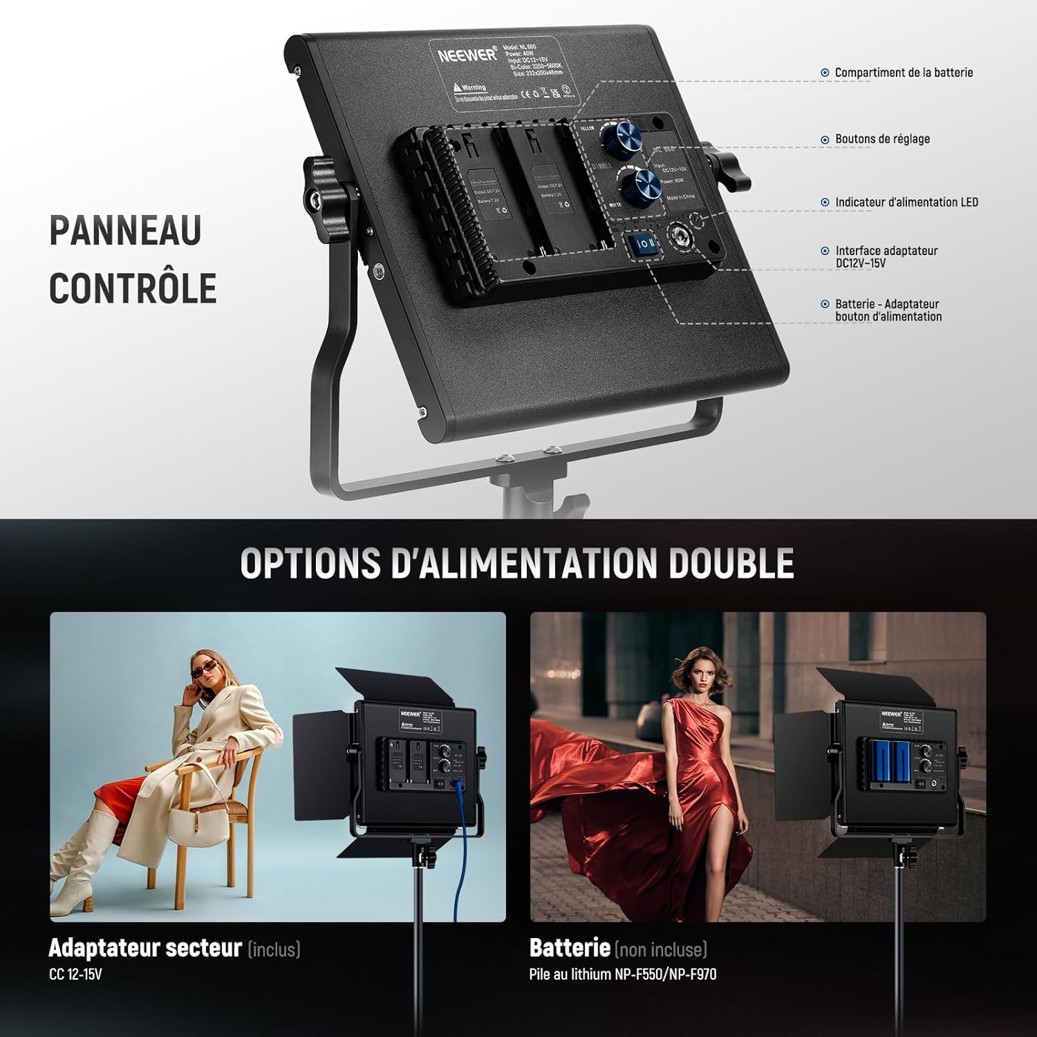 - 【Options de double alimentation et d'affichage LCD】Alimentez les lumières avec un adaptateur secteur (inclus) ou profitez d'un fonctionnement sans fil avec une batterie lithium-ion NP-F550 ou NP-F970 (non incluse) lors de prises de vue en extérieur. L'écran LCD haute définition vous permet de vérifier la luminosité, la température de couleur et la puissance de la batterie en temps réel.