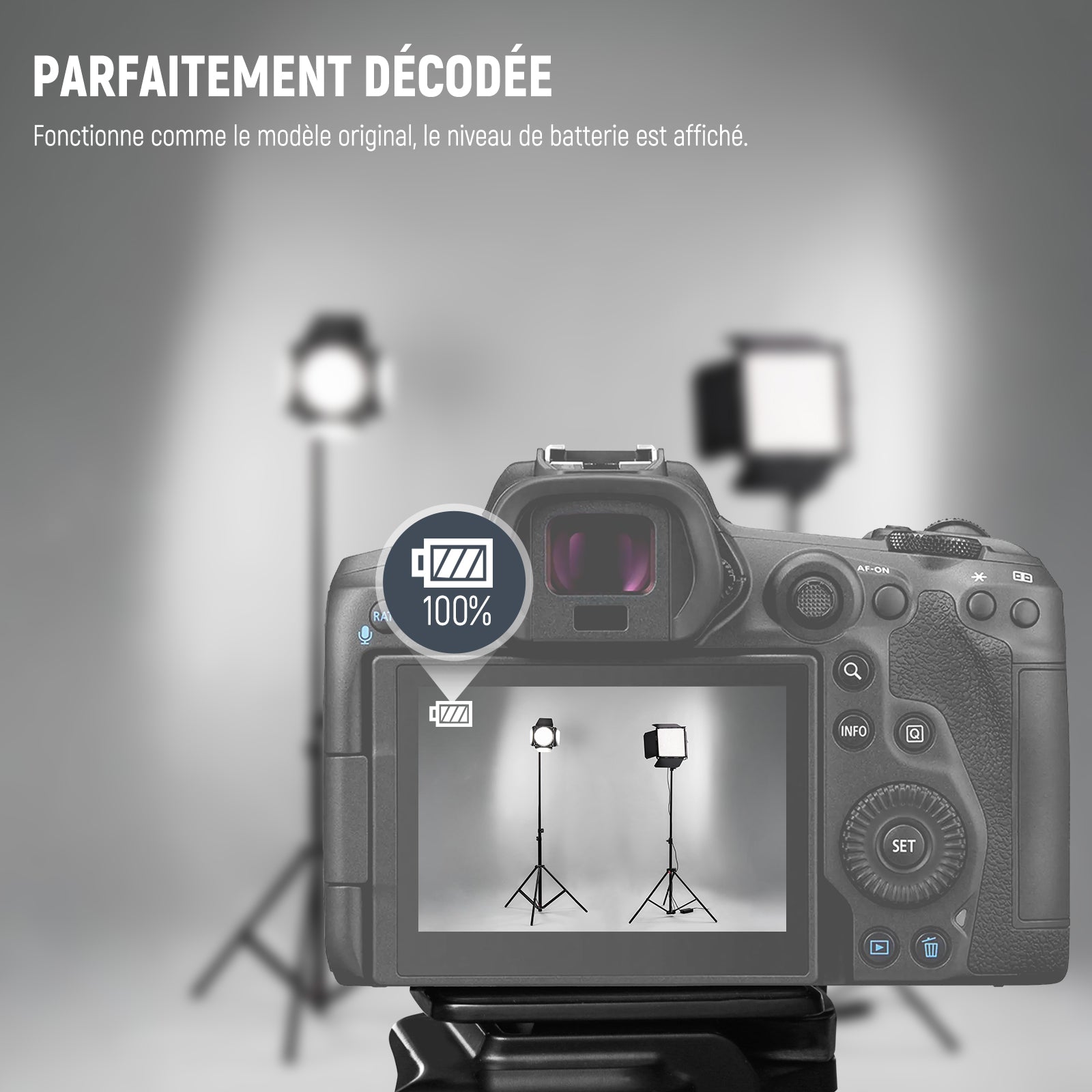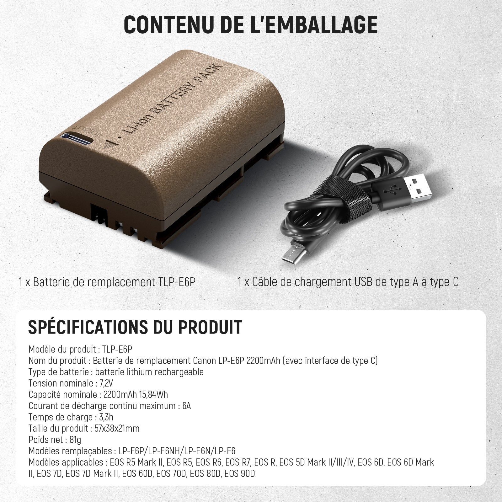 - Remplace les modèles de batterie : LP-E6P/LP-E6NH/LP-E6N/LP-E6