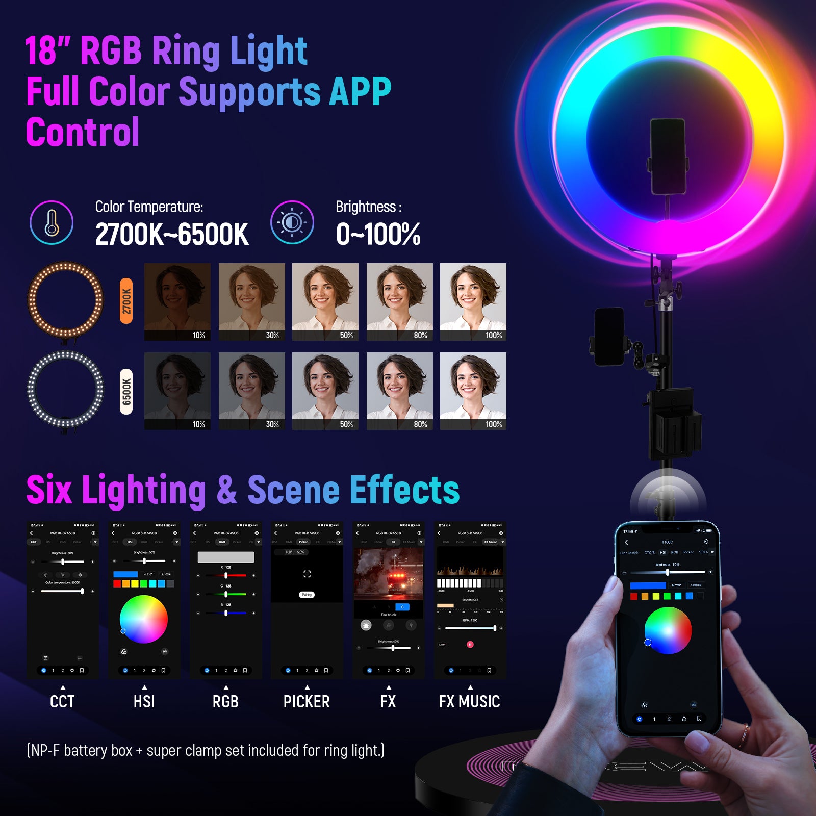 - 1 x anneau lumineux RVB et sac de transport