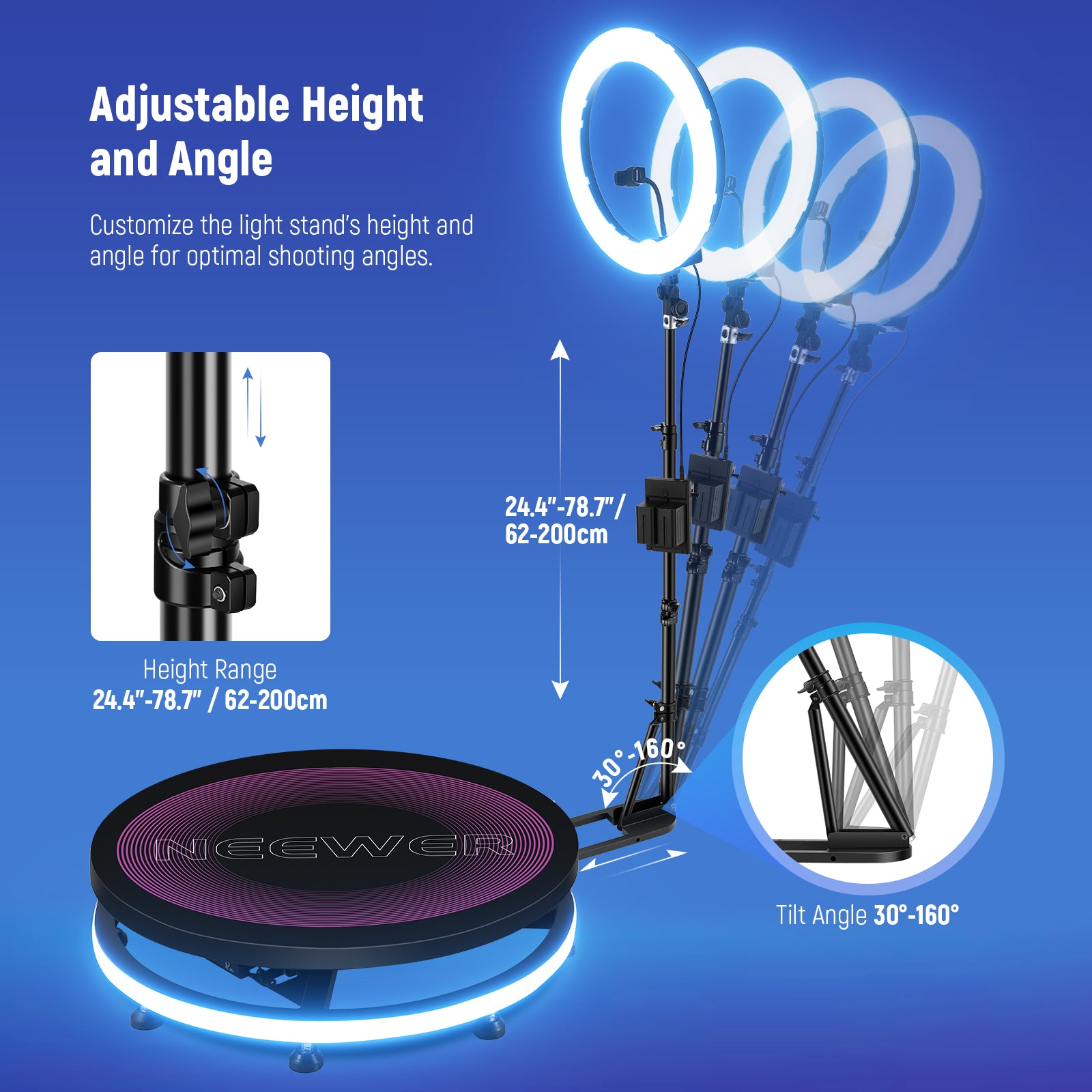 - Hauteur flexible et montage sur plusieurs appareils - la hauteur du support d'éclairage est réglable en trois sections (24,4"-78,7"/62-200 cm) et permet des réglages d'angle avant et arrière. Associé à l'inclinaison à 180° de l'anneau lumineux, vous obtenez une prise de vue multi-angle sans effort. Utilisez des accessoires tels que les supports de téléphone/tablette inclus et les super pinces pour enregistrer simultanément plusieurs appareils pendant de courtes vidéos, la diffusion en direct et la création de contenu.