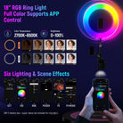 - Anneau lumineux RVB de 18" - Le NEEWER RGB18 (II) offre une excellente lumière couleur à 360° avec une inclinaison réglable à 180°. Il offre six modes de gradation, dont CCT/HSI/RGB/Picker/FX/FX Music, et prend en charge l'éclairage de scène prédéfini. effets qui se synchronisent avec la musique. Avec une plage de température de couleur réglable de 2500 K à 10000K et un CRI97+ élevé, il est parfait pour les besoins d'éclairage d'appoint de plusieurs personnes. La télécommande Bluetooth via l'application NEEWER améliore sa convivialité.