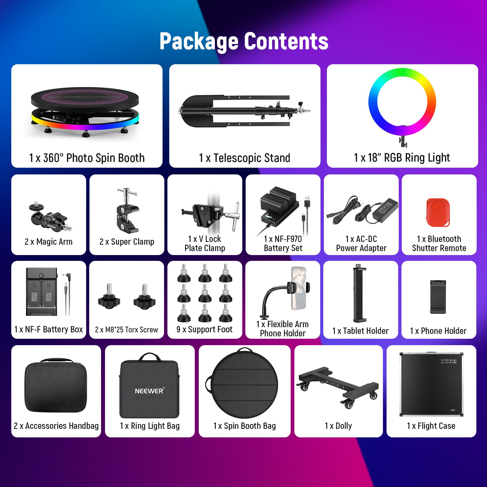- Cabine photo selfie panoramique à 360° - Présentation du kit NEEWER 360 Photo Booth, une solution tout-en-un pour les créateurs de contenu et les streamers YouTube/TikTok. Il combine une rotation à 360° de 100 cm/39,4" (couverture d'image personnalisable), une bande LED RVB et un anneau lumineux RVB de 18" avec contrôle APP, ainsi que divers accessoires prenant en charge plusieurs appareils. Idéal pour les prises de vue à 360°, les ralentis HD, les GIF et vidéo pour 1 à 3 personnes ou objets, faisant passer vos projets artistiques et commerciaux au niveau supérieur Anneau lumineux RVB 18" - Le NEEWER RGB18 (II) présente d'excellentes caractéristiques