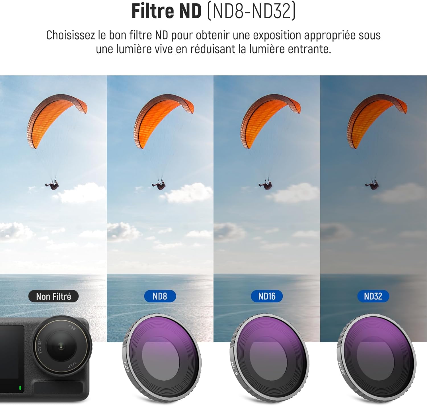 - 【Exposition équilibrée pour des prises de vue en extérieur de qualité supérieure】 Les filtres de caméra d'action ND8, ND16 et ND32, offrant une réduction de la lumière de 3, 4 et 5 arrêts respectivement, offrent un contrôle précis de l'exposition lors d'activités de plein air dynamiques. Ils empêchent efficacement la surexposition et améliorent la qualité de l'image dans une gamme de conditions d'ensoleillement