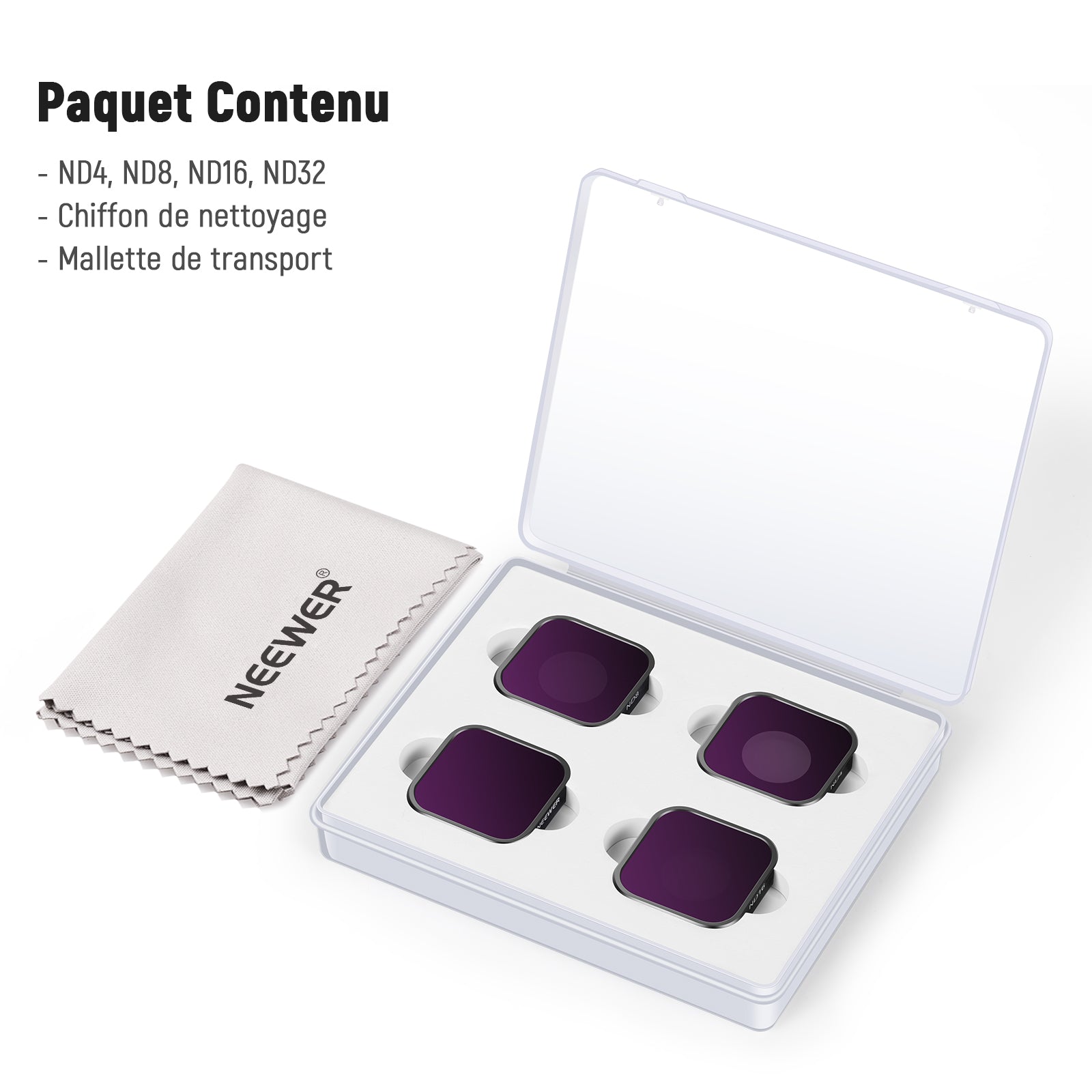 - 1xfiltre ND4,1xfiltre ND8,1xfiltre ND16,1x filtre ND32,1xboîte d'emballage
