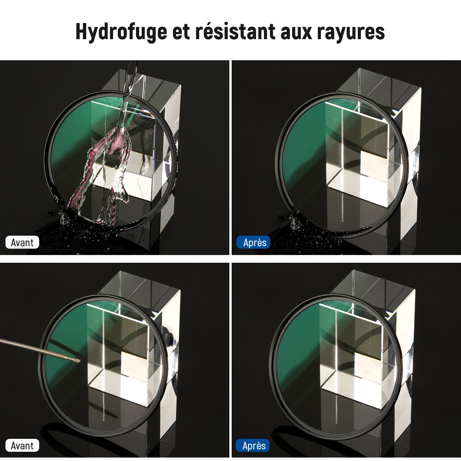 - Revêtement nano double face : 30 couches de nano-revêtements sur les deux côtés protègent le filtre optique HD contre les rayures, les traces de doigts, les taches et la poussière tout en conservant la clarté pour des photos nettes et détaillées