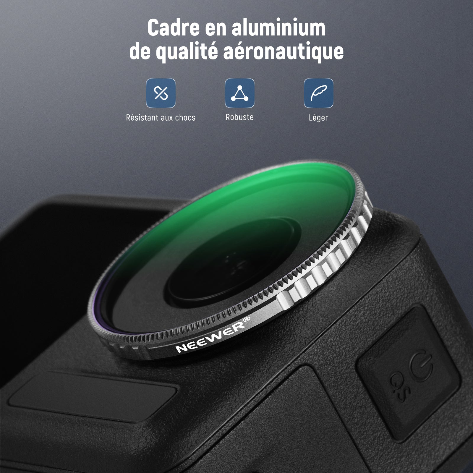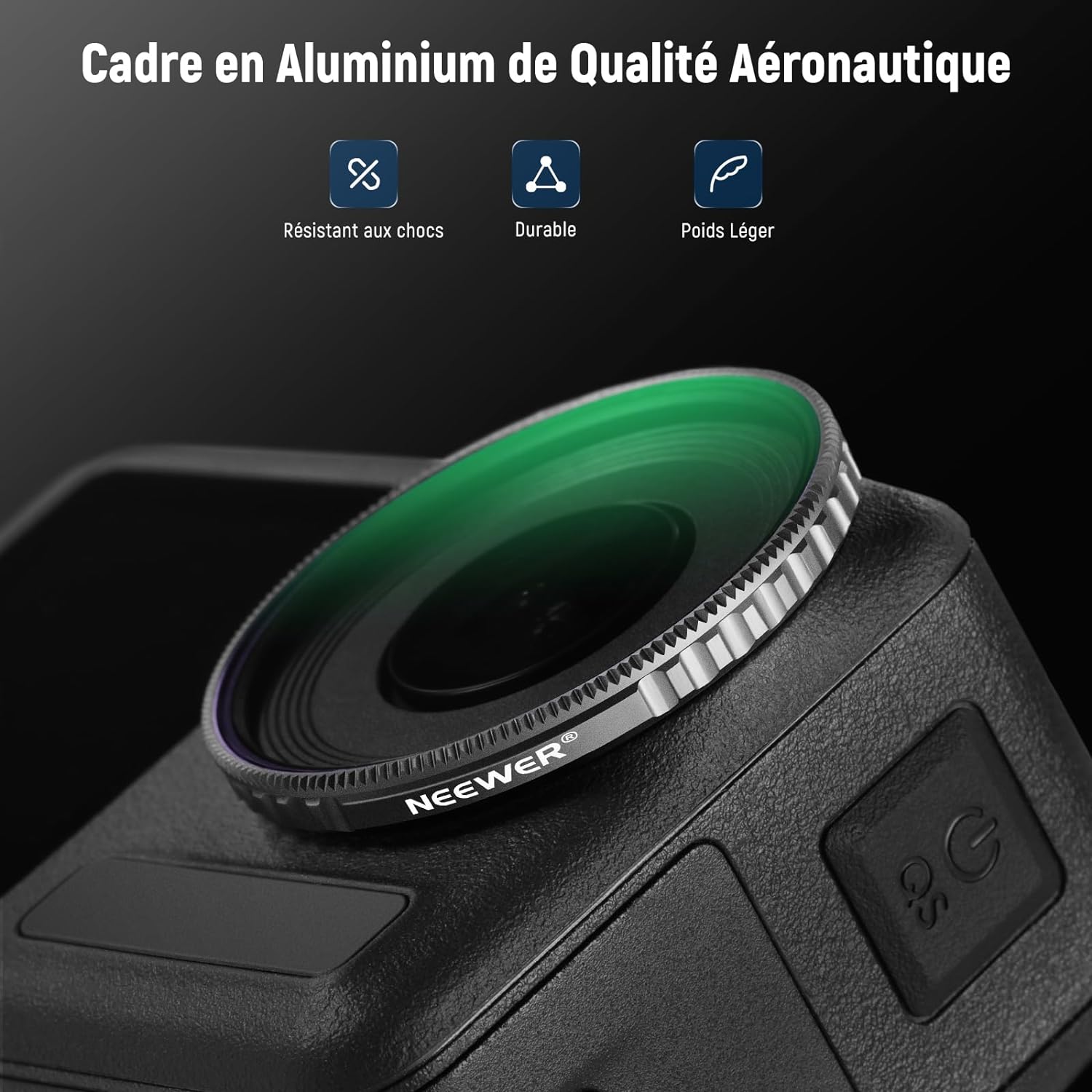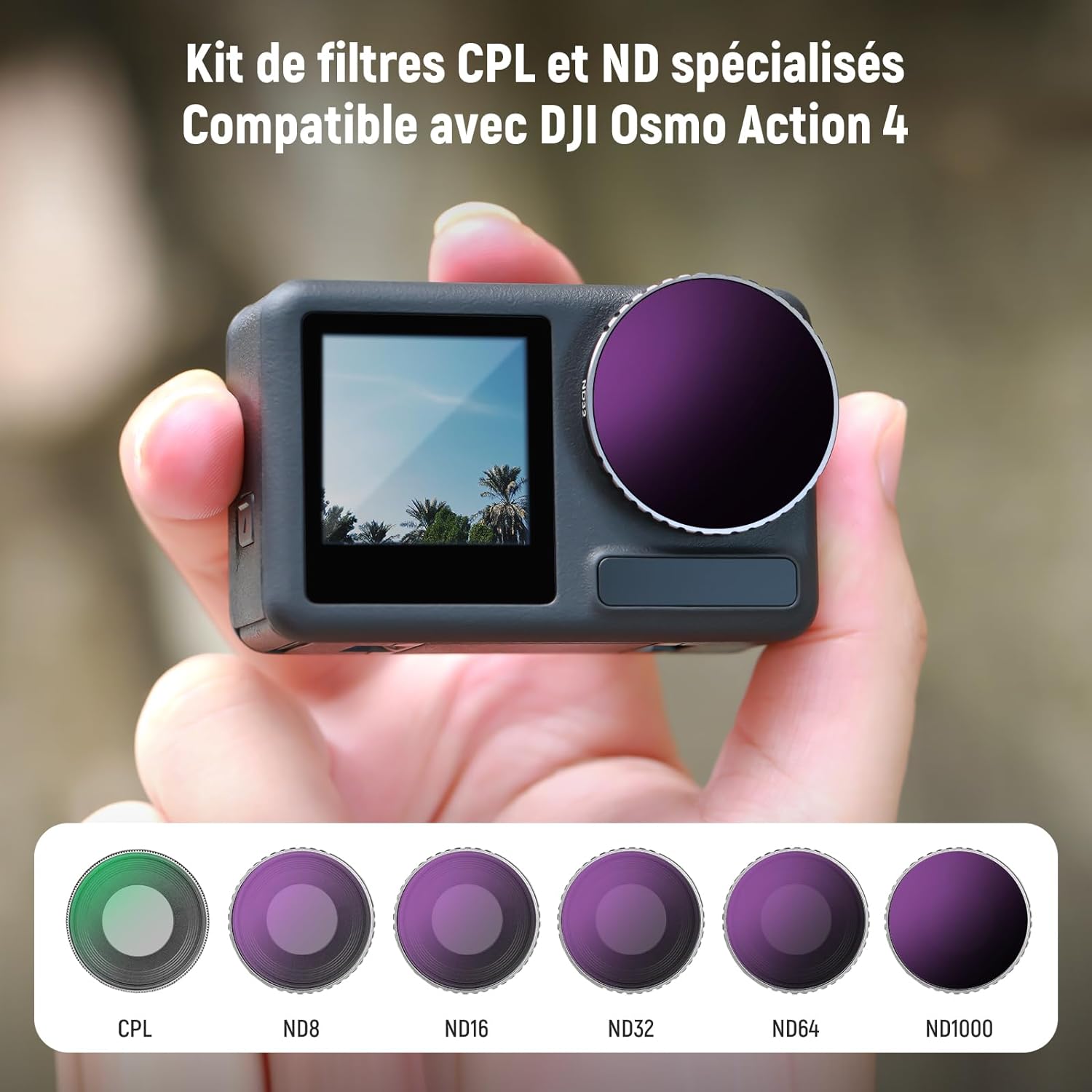 - 【Uniquement pour Osmo Action 5 Pro/4】Compatible uniquement avec les DJI Osmo Action 5 Pro et Action 4.Ce jeu de filtres est conçu en verre optique HD pour garantir une image claire, même lors d’activités sportives intenses — idéal pour les prises de vue immersives en surf, kayak, ski, VTT, parachutisme, skateboard et autres sports extrêmes.Remarque : Non adapté à une utilisation sous-marine, car l’eau peut s’infiltrer et altérer la qualité d’image.