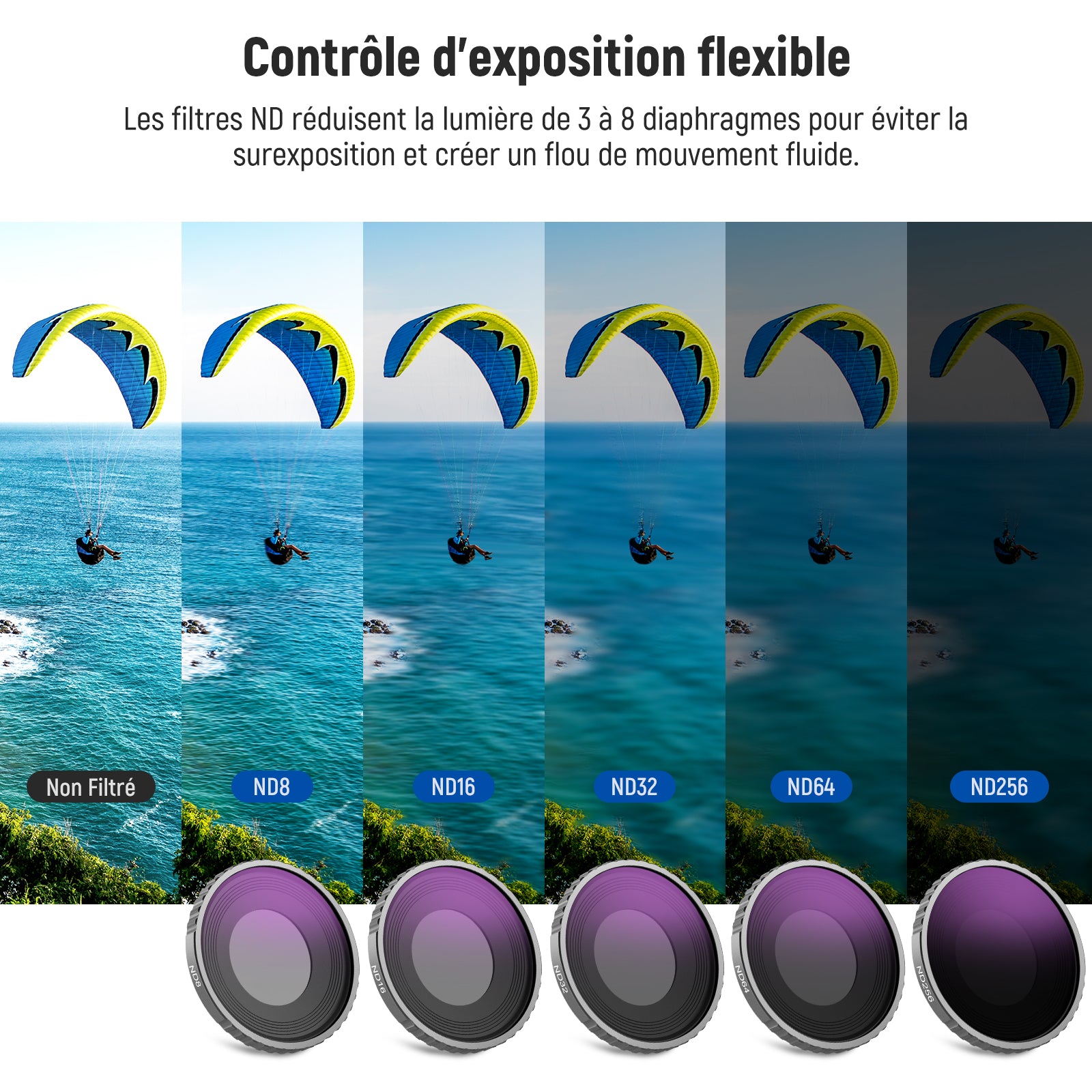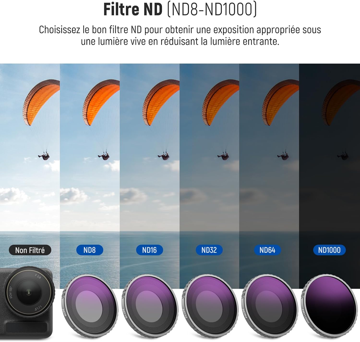- 【Exposition équilibrée pour des prises de vue en extérieur de qualité supérieure】Les filtres de caméra d'action ND8,ND16,ND32,ND64 et ND1000,offrant une réduction de la lumière de 3,4,5,6 et 10 arrêts respectivement,offrent un contrôle précis de l'exposition lors d'activités de plein air dynamiques.Le filtre ND1000 est idéal pour obtenir de superbes effets de longue exposition.Ils empêchent la surexposition et améliorent la qualité de l'image dans diverses conditions d'ensoleillement