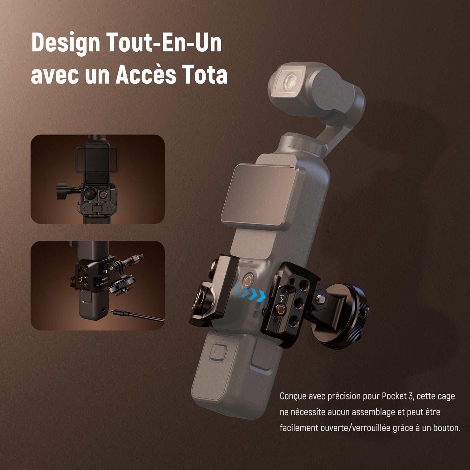 - Design tout-en-un avec accès complet : conçue avec précision pour Pocket 3, cette cage ne nécessite aucun assemblage et peut être facilement ouverte/verrouillée avec un bouton. Le design ajusté garantit un accès complet aux boutons et à l'écran rotatif, et maintient le port de charge complètement débloqué