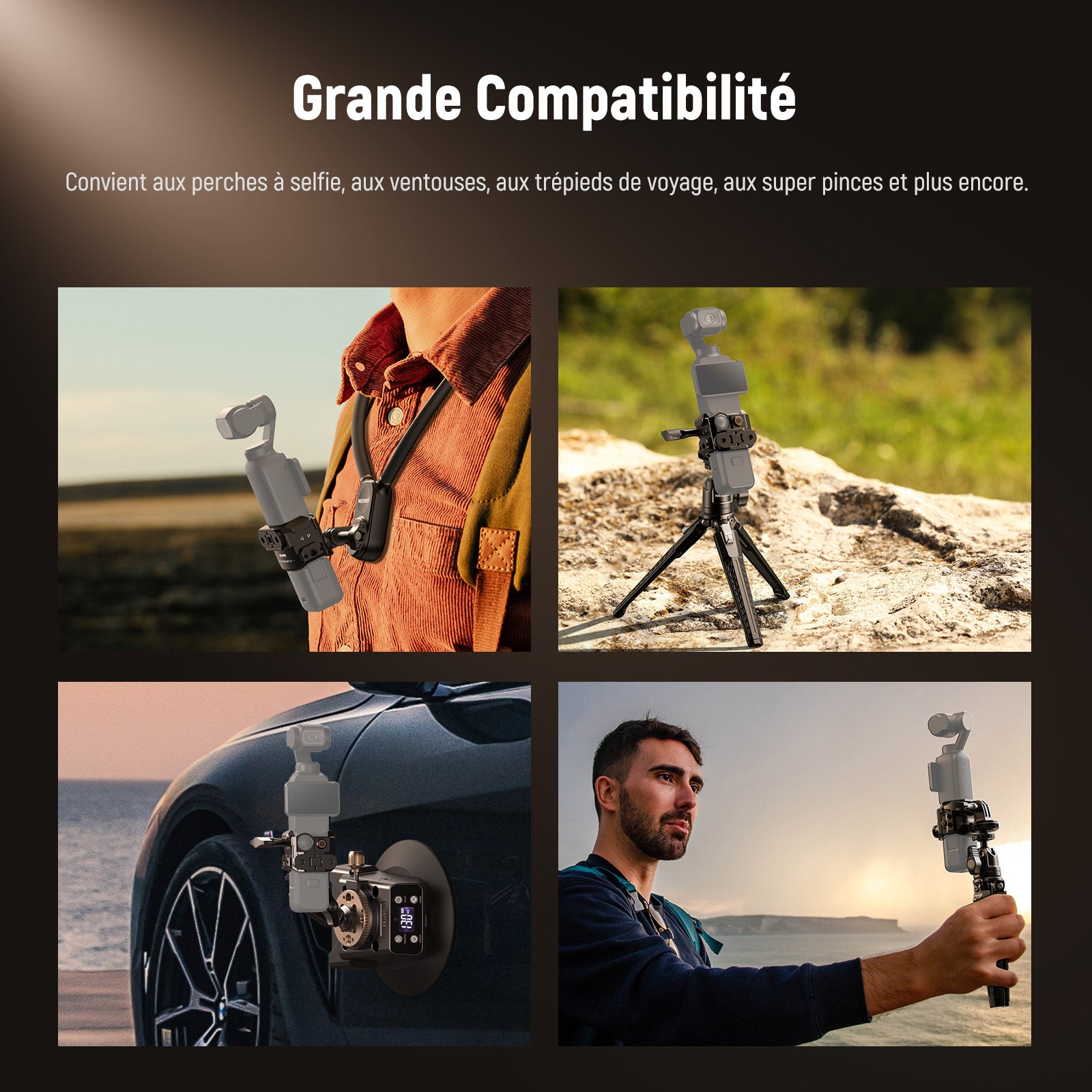 - Montable sur différents supports : avec des doigts pliables intégrés et l'adaptateur de support de caméra d'action inclus, votre Pocket 3 peut être connecté en toute sécurité à des supports POV, des perches à selfie, des ventouses, des trépieds de voyage, des clips de sac à dos, des super pinces et d'autres supports pour la prise de vue créative