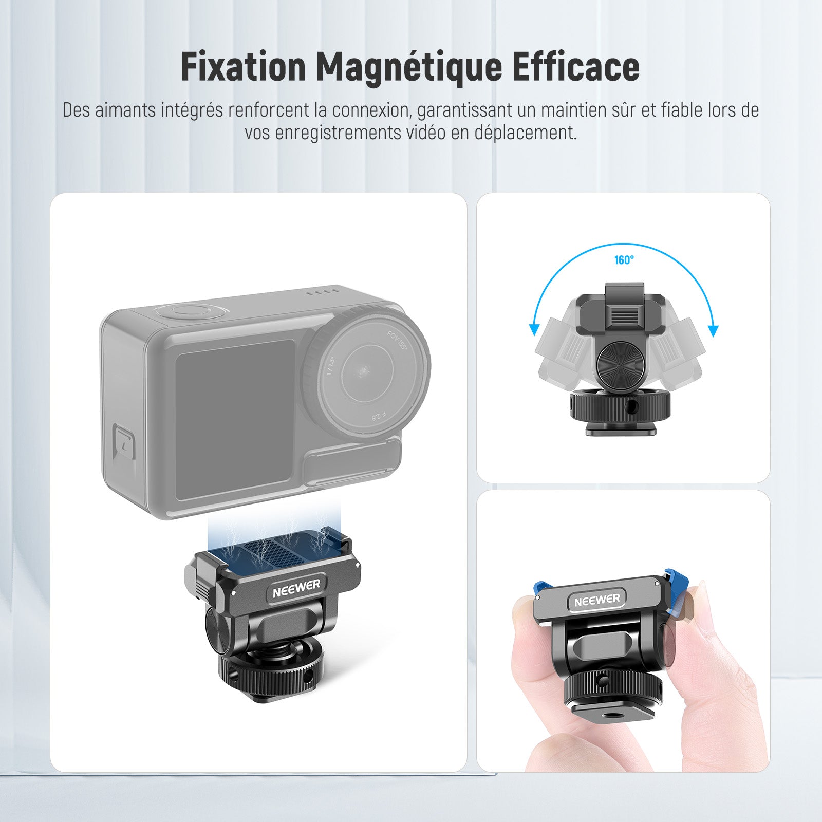 - Support magnétique pour griffe : le support de griffe à dégagement rapide peut immédiatement être enclenché et renforcer la fixation en utilisant ses aimants intégrés. Une inclinaison réglable à 160° permet un positionnement flexible pour des angles de prise de vue polyvalents