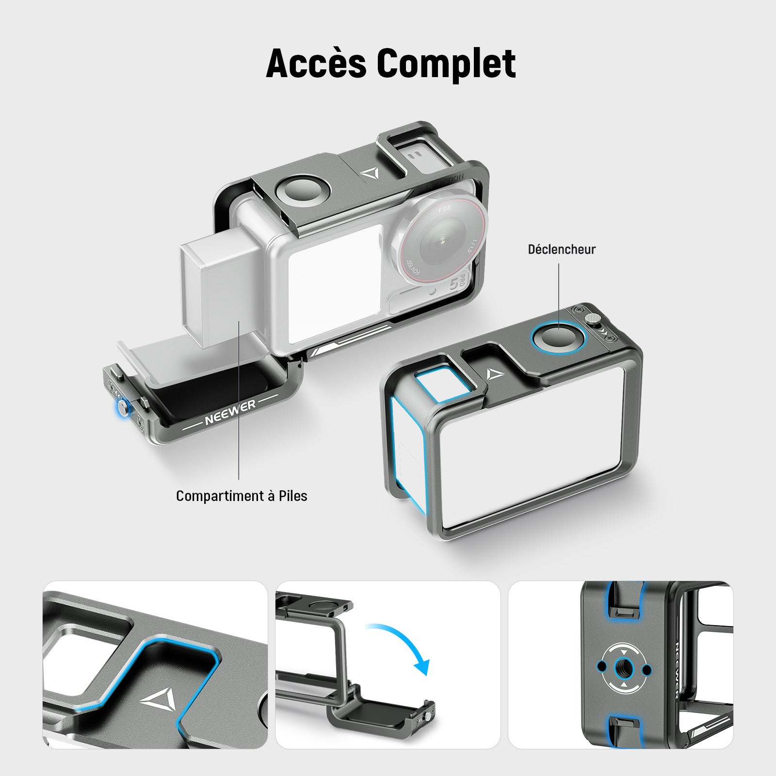 - Cage de caméra d'action précise : conçue avec précision, la cage permet un accès complet à toutes les fonctions et dispose d'un bouton d'obturation tactile pour améliorer le contrôle. En gardant le port USB C débloqué, il est compatible avec DJI Mic Rx et d'autres périphériques périphériques. Installation et retrait sans effort via le verrou coulissant, aucun assemblage n'est nécessaire