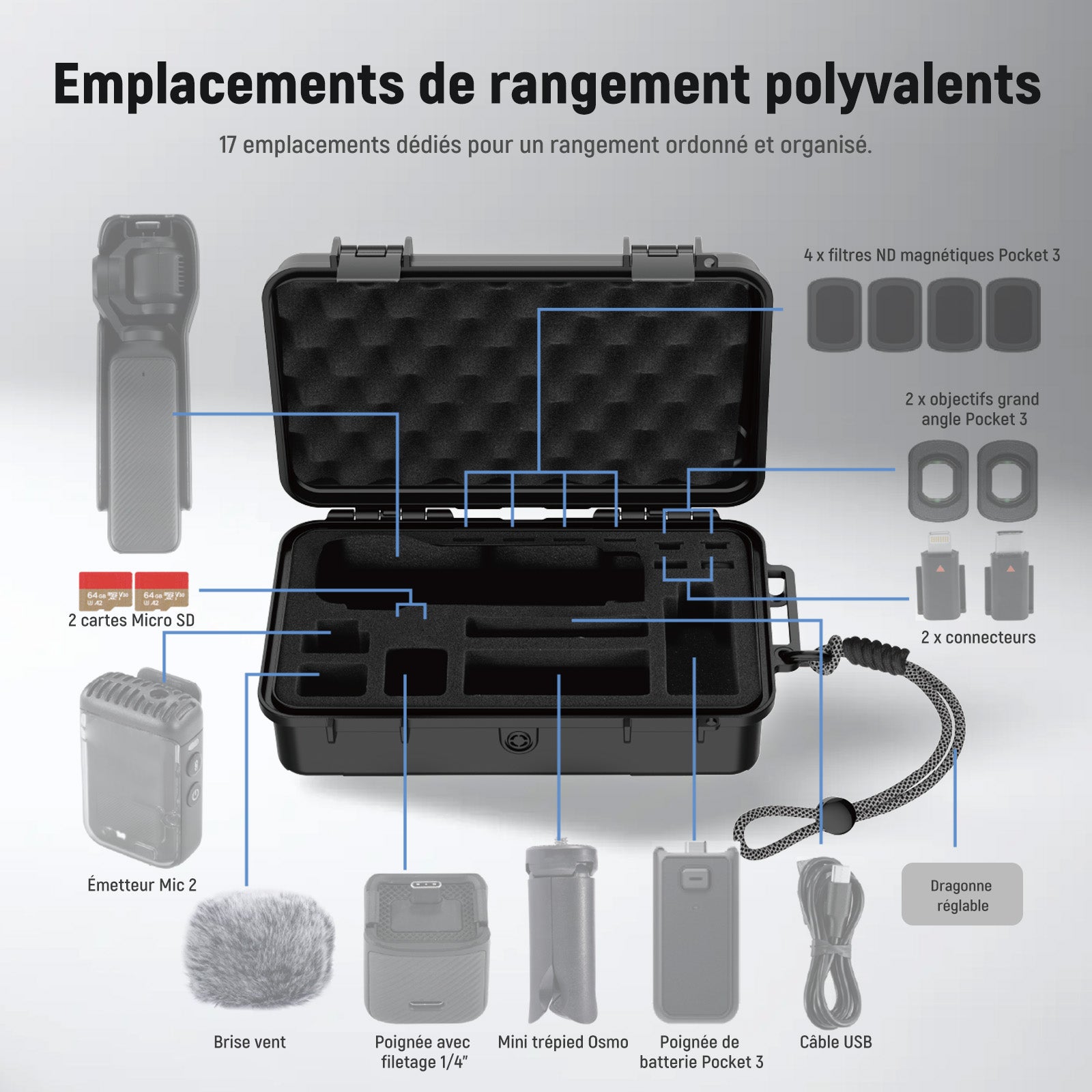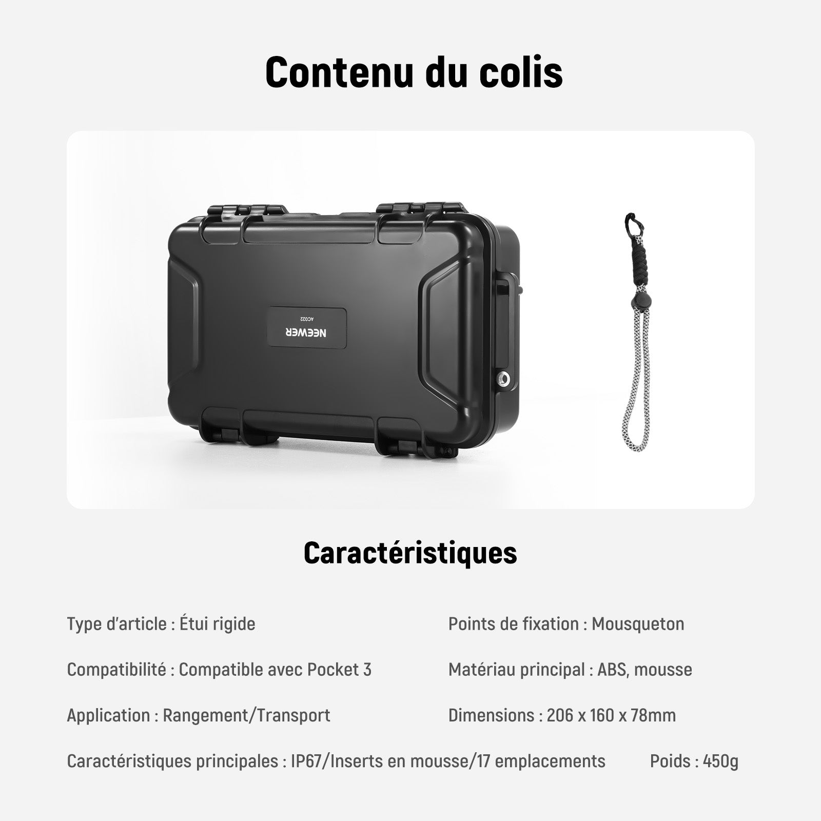 - Contenu de la livraison : 1 étui rigide pour Pocket 3, 1 dragonne, 1 mousqueton, 1 manuel d'utilisation (français non garanti). Remarque : tous les accessoires du combo Pocket 3 Creator sont vendus séparément